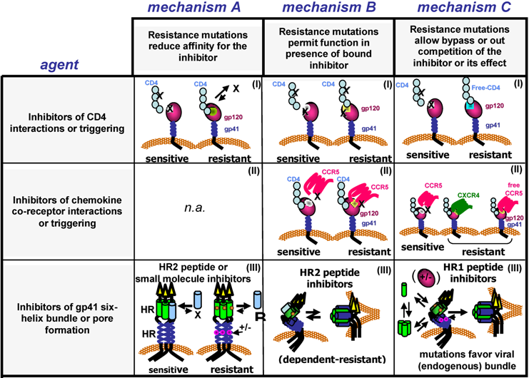 This review summarizes concepts in the emergence of resistance to entry inhibitors. The entry inhibitors that will be discussed cover the major steps in HIV entry: agents that interrupt productive interactions between Env and the CD4 receptor or between Env and the chemokine co-receptor, agents that interfere with Env-mediated fusion between virus and host cell membranes, and other inhibitors that are not easily classified. The discussion selects examples of inhibitors for which in vitro or in vivo resistance data are available to highlight particular points, but makes no attempt to include all entry inhibitors in the published literature [7,8,9,10]. The perspective centers on insights into the mechanism of virus entry rather than on the practical application of therapeutics in the clinic. The ideas conveyed will nonetheless hopefully form the basis for new strategies for developing and using entry inhibitors.