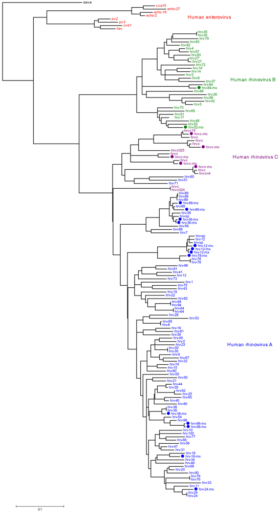 Phylogenetic tree of 5′-nontranslated region (5′-NTR) sequences of human rhinovirus (HRV) from nasal swabs. The phylogenetic tree was constructed by means of the maximum likelihood method. Reference strains of each species obtained from GenBank are indicated, and the species assignment in this study is indicated by circles. Accession numbers are JQ000010 to JQ000029.