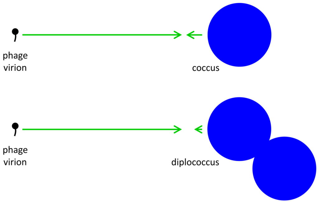 even if bacteria otherwise experience benefits from forming into arrangements, that is, reduced formation of arrangements could serve as a bacterial anti-phage strategy. In simple terms, a coccus might encounter a phage approximately half as often as a diplococcus.