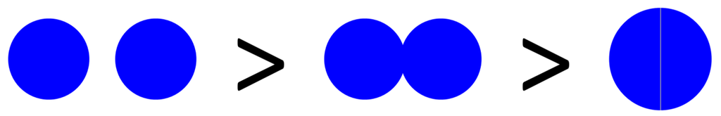 Shading of bacteria by bacteria. Shown is a progression starting with two “free” coccus-shaped bacteria (left) which is followed by a diplococcus displaying some degree of attachment (middle) that in turn is followed by a diplococcus displaying maximal attachment as well as minimized surface-to-volume ratio (right), i.e., existing as a combined-volume sphere of 21/3 -fold increased radius over an individual cell (see calculation, below). The left-hand lack of arrangement shows no shading whereas the right-hand arrangement shows an approximation of maximal shading for a combined spherical shape. The middle arrangement displays some intermediate degree of shading and therefore some intermediate overall target size between maximal and minimal (holding cell volumes constant). Note that the volume of a sphere, V1, is equal to