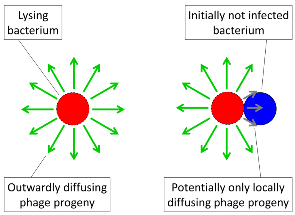 specifying inefficiencies in this phage adsorption process in comparison to free bacteria. In addition, phage adsorption to arrangements is not identical to phage adsorption to free bacteria because only a fraction of the number of bacteria making up an arrangement become initially phage adsorbed (i.e., 1/n) rather than all of the bacteria making up a free bacterium (1/1). Furthermore, with bacterial arrangements an initial (“primary”) phage adsorption could give rise to a variety of subsequent outcomes including infection of only the adsorbed bacterium, subsequent infection of a fraction of the bacteria found within the arrangement, or indeed subsequent infection of all of the bacteria making up an arrangement. The latter result, of course, is the more costly of outcomes to the affected bacteria, just as it is in terms of prey aggregation more generally [36]. The result is that an additional assumption must be made to argue that the vulnerability of bacterial arrangements to phages can be greater than that seen for individual bacteria. This assumption, in particular, is that the efficiency of phage propagation among bacteria found within arrangements must be greater than that which can be sustained among free bacteria.When phage densities are higher, then the likelihood of phage adsorption of a given bacterium also should be higher, as described by Equation (1). Importantly, then, the density of phages immediately surrounding a lysing bacterium, that is, as made up predominantly of those phages released from that bacterium, will be the highest phage densities that can be readily attained within a given environment. The phages released in this burst will then diffuse outward, declining in density as they do. The result should be a higher rate of phage adsorption to any susceptible bacterium found within the immediate vicinity of a lysing bacterium, but lower rates at increasing distances (assuming that phage intrinsic adsorption ability does not substantially increase over the course of environmental diffusion).
