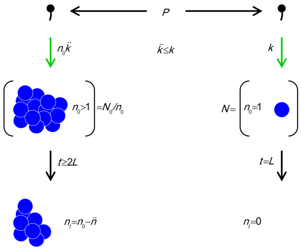 Analogously, greater bacterial densities found within bacterial arrangement can be viewed as possessing a higher “mass” relative to that associated with planktonic bacteria, where by “mass”—potentially confusingly—I am referring to immediately local densities of bacteria. This “mass” of bacteria within a bacterial arrangement would be more likely to exceed a “critical” level, such that phage propagation can be sustained, than may be achieved by an equivalent number of more locally dilute, free bacteria. This perspective is just as one can consider for nuclear fission, i.e., radioactive decay, and associated chain reactions [45], which occurs more rapidly given higher “fuel” densities. Indeed, the idea of a “critical mass” can be directly equated with phage proliferation thresholds, that is, those bacterial densities at which rates of phage population growth are perfectly balanced by rates of phage loss [19,25]. Each is a description of target densities (atoms or bacteria) that can be sufficiently high that collision with targets (by neutrons or phages), in combination with subsequent proliferation (via fission or infection), balances any losses that can occur due either to interactions with nontargets or movement away from the focus “mass”.