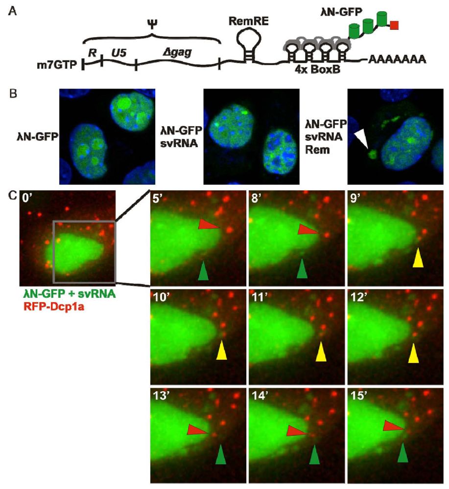 Localization of mouse mammary tumor virus (MMTV) RNA with P-body proteins. (A) Diagram of MMTV subviral RNA containing the MMTV packaging signal (Ψ), the Rem response element (RemRE), and 4 BoxB loops bound by the λN-GFP reporter. (B) NMuMG cells transfected with λN-GFP alone (left); λN-GFP and svRNA (middle); or λN-GFP, svRNA, and Rem (right). Fixed cells were imaged using a Leica SP2 confocal microscope. White arrow indicates cytoplasmic accumulation of λN-GFP bound to svRNA. (C) Live-cell co-imaging of MMTV svRNA and RFP-Dcp1a in NMuMG cells. Green arrows indicate svRNA alone; red arrows indicate RFP-Dcp1a alone; yellow arrows indicate colocalization between the svRNA and RFP-Dcp1a.