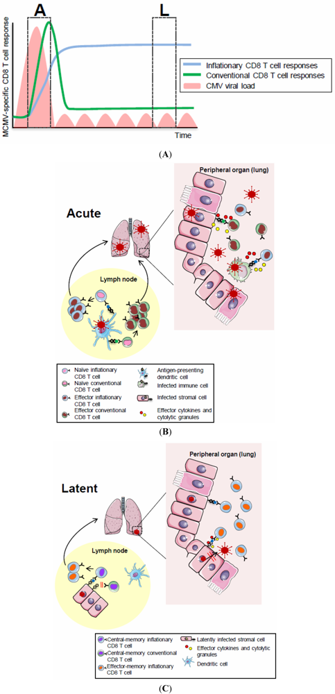 (A) CD8 T cell dynamics during acute and latent MCMV infection. The acute phase (“A”) of MCMV infection is characterized by lytic viral replication (pink areas) which is controlled by NK and T cells with an organ-specific kinetics. The following phase of latent infection (“L”) is thought to be associated with local viral reactivation events which are readily controlled by MCMV-specific immunity. CD8 T cell responses specific for the majority of MCMV-derived epitopes follow a classical expansion, contraction and memory phase (green, conventional response) while CD8 T cells with some MCMV-specificities undergo memory inflation (blue, inflationary response), eventually stabilizing at high numbers with an activated phenotype. (B) CD8 T cell priming in secondary lymphoid organs. Priming of conventional and inflationary MCMV-specific CD8 T cell responses occurs in secondary lymphoid organs and largely depends on the presence of cross-presentation competent dendritic cells. Activated MCMV-specific CD8 T cells, equipped with effector functions, exit secondary lymphoid organs and home to peripheral tissues where they contribute to control of lytic MCMV replication; (C) Memory CD8 T cell inflation during latent MCMV infection. Inflationary MCMV-specific CD8 T cells accumulate in peripheral tissues where they are maintained at high numbers with an effector memory phenotype. This memory CD8 T cell inflation is triggered by MCMV antigen recognition on latently infected non-hematopoietic cells within lymph nodes where inflationary CD8 T cells exhibiting a central memory phenotype are restimulated to proliferate, to acquire effector phenotypes and to migrate into peripheral tissues where they contribute to local immune-surveillance of latent/reactivating MCMV infection.