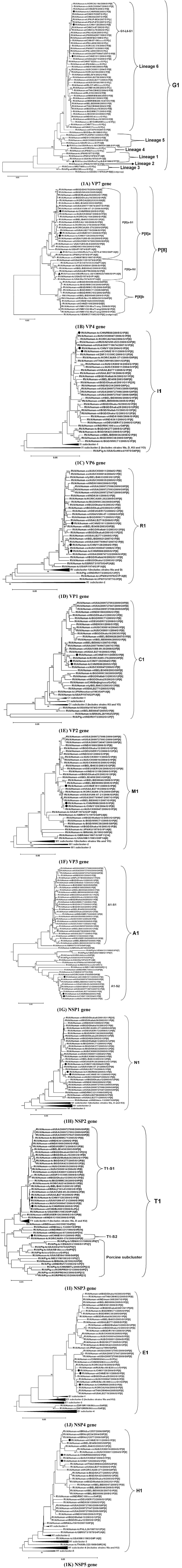 (A-K) Phylogenetic trees constructed from the nucleotide sequences of VP7, VP4, VP6, VP1-3 and NSP1-5 genes of rotavirus strains RVA/Human-wt/CHN/E1911/2009/G1P[8], RVA/Human-tc/CHN/R588/2005/G1P[8],RVA/Human-tc/CHN/Y128/2004/G1P[8], with those of the other group A rotavirus strains. Although strains representing all the RV-A genotypes were included in the phylogenetic analyses to prepare the dendograms, only those relevant to the present analysis are shown in Figure 1A-K. In all trees, positions of strains E1911, R588 and Y128 are shown by closed circles. In Figure 1A and 1B, triangles indicate the G1 and P[8] RVA strains contained in the currently licensed rotavirus vaccines Rotarix™ and RotaTeq™. Scale bar, 0.05 substitutions per nucleotide. Bootstrap values less than 85% are not shown.