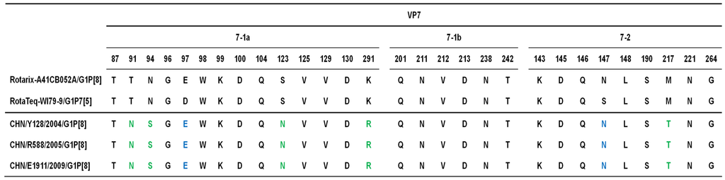 Alignment of the amino acid residues defining the neutralization domains (designated as 7-1a, 7-1b and 7-2 [24]) of VP7 between the G1 strains in Rotarix™ and RotaTeq™ and Chinese RVA strains Y128, R588 and E1911. Green indicates the residues that differ from those of both Rotarix™ and RotaTeq™. Blue indicates the residues identical to those of Rotarix™, but different from those of RotaTeq™.