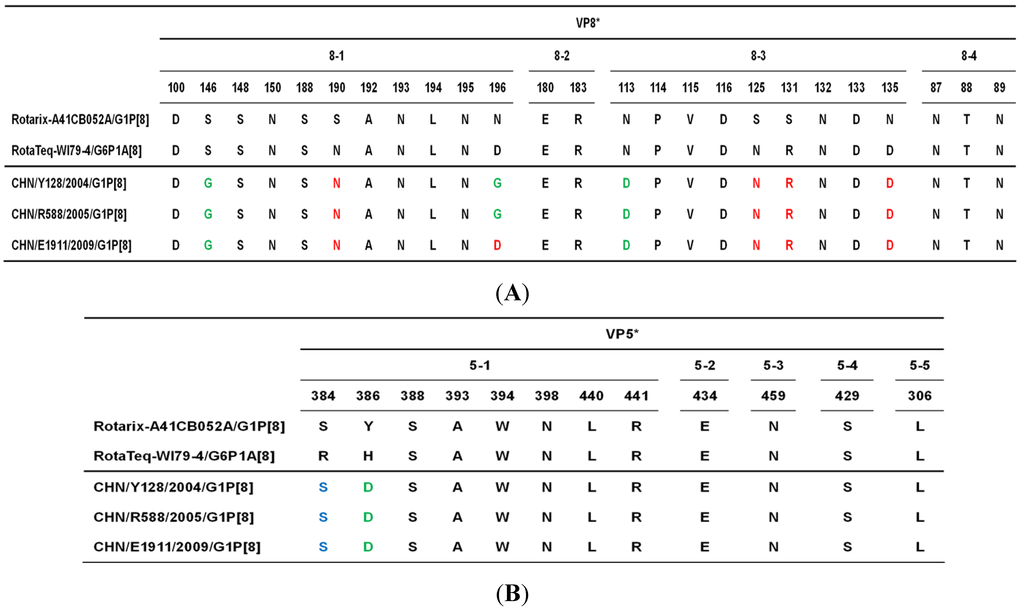 Alignment of the amino acid residues corresponding to those defining the VP4 neutralization domains (designated as 8-1, 8-2, 8-3 and 8-4 in the VP8* subunit (A) and 5-1, 5-2, 5-3, 5-4 and 5-5 in the VP5* subunit (B) of VP4) [24]) between the P[8] strains in Rotarix™ and RotaTeq™ and Chinese RVA strains Y128, R588 and E1911. Green indicates the residues that differ from those of both Rotarix™ and RotaTeq™. Red indicates the residues identical to those of RotaTeq™, but different from those of Rotarix™. Blue indicates the residues identical to those of Rotarix™, but different from those of RotaTeq™.