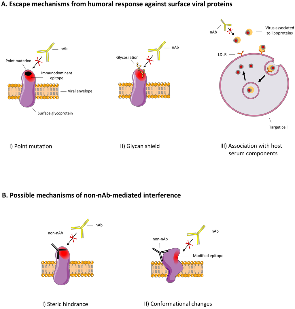 (A) Schematic representation of viral escape mechanisms from humoral immune response against surface viral proteins: point mutations on immunodominant regions, glycosylation of functionally pivotal residues (glycan shield) of the viral surface proteins and virus association with host serum components (e.g., lipoproteins) (B) Mechanisms of interference on nAb-mediated virus neutralization by the binding of interfering non-nAbs: non-neutralizing/interfering Abs might interfere with the binding of nAbs by steric hindrance following a spatial occupancy of their epitope or a competition for the binding; otherwise the binding of non-neutralizing/interfering Abs may induce conformational changes on the viral protein, thus affecting nAb binding to the antigen. Non‑neutralizing/interfering Abs are depicted in black while nAbs in yellow.