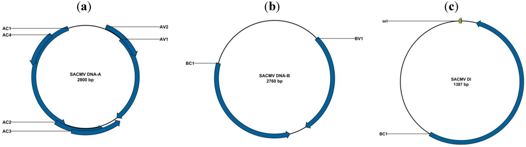 - Stanley, J. Subviral DNAs associated with geminivirus disease complexes. Vet. Microbiol. 2004, 98, 121–129. [Google Scholar] [CrossRef]