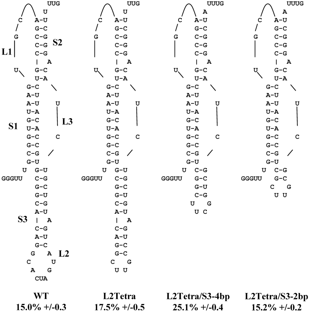Experiments were designed to test the effects of changes to the length of stem 3 while still maintaining a stable structure. Beginning with the wild-type stem 3 containing nine paired bases and a nine residue loop, the following series of mutants were constructed. First, the loop capping stem 3 was replaced with a shorter tetraloop; the L2Tetra construct contains ten paired bases and a four residue loop. This was used as the basis for construction of two additional tetraloop constructs with progressively shorter stem 3 structures: L2Tetra/S3-4bp, containing only four paired bases in the stem, and L2Tetra/S3-2bp, which has only two paired bases. The 5’-uucg-3’ tetraloop sequence used in the L2Tetra/S3-4bp mutant was selected because the last base-pair before the tetraloop affects its formation. The closing pair for UNCG tetraloops is usually C-G compared to the G-C closing base-pair found in CUUG tetraloops. All of the truncated structures promoted frameshifting at levels equal to or greater than the wild-type pseudoknot structure using a dual luciferase reporter assay (Figure 1). Interestingly, the L2Tetra/S3-4bp mutant stimulated frameshifting at 25.1% compared to the 15 to 17.5% observed for the other stem 3 mutants. It is possible that the difference in the tetraloop contributed to the slight increase in frameshifting efficiency. These results, and experiments reported by Brierley et al., for another coronavirus [12] indicate that the length of stem 3 does not play a critical role in frameshifting, suggesting that it may serve some other function.