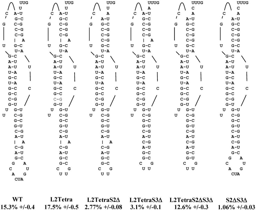 While the high degree of phylogenetic conservation of stem 3 in many coronaviruses [9] suggests that it serves an important function, mutations in this element have less impact on frameshifting efficiency than mutations in stem 2 [9,11,12]. Prior structural analyses also suggested that the stability of the structure may contribute to frameshifting efficiency. Here, specific changes were made to Stem 3 in order to directly address this issue.