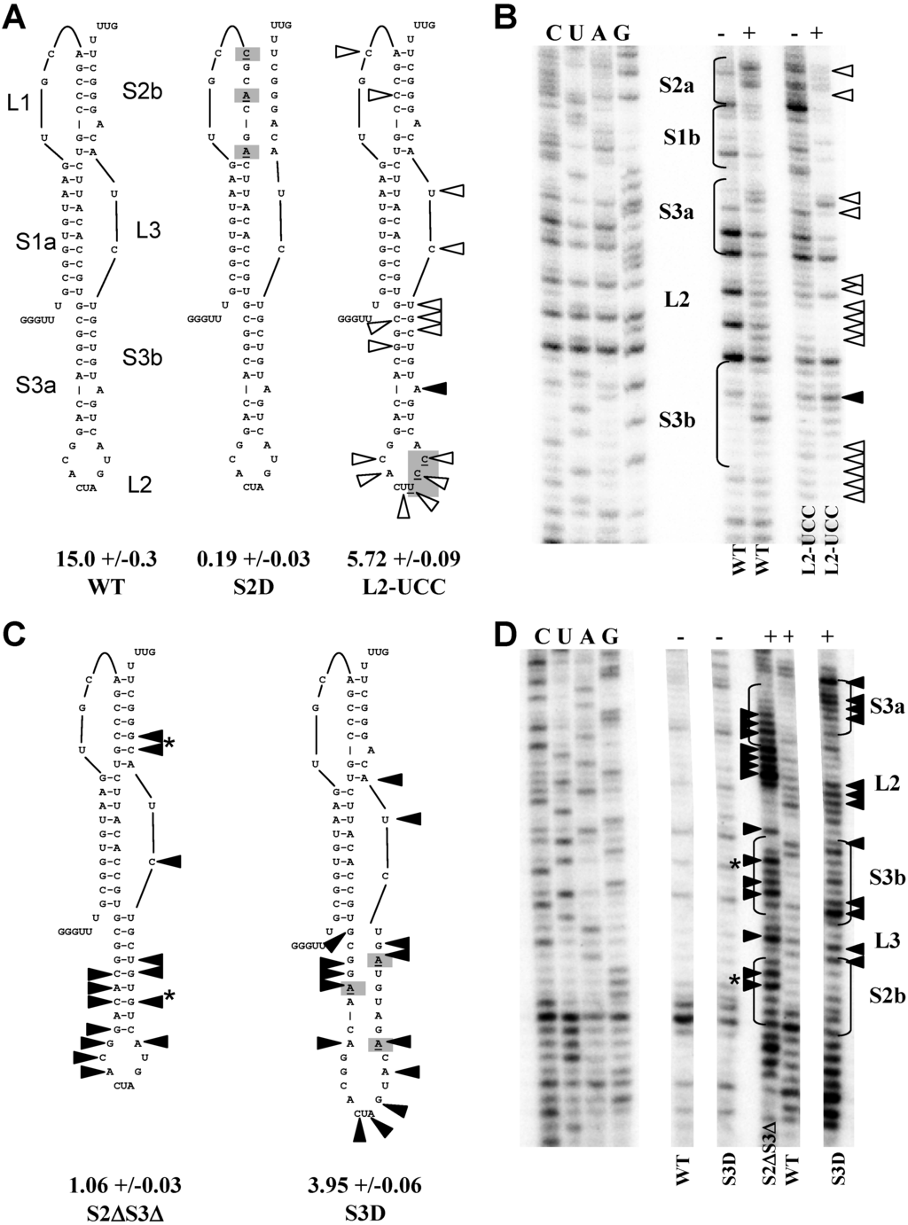 Having established this baseline, S3D and S2ΔS3Δ mutants were evaluated by SHAPE. In contrast to the L2-UUC pseudoknot mutant, the S3D and S2ΔS3Δ pseudoknots were more reactive to NMIA indicating that they are less structured (Figure 3D). In addition to the expected changes in reactivity to the mutated bases in stem 3, bases in the 3’ region of both loop 2 which caps stem 3 and the loop joining stems 2 and 3 (L3) also showed increased reactivity for S3D. The S2ΔS3Δ mutant was also more reactive to NMIA. However, the NMIA reactivity pattern of the S3D mutant, with more reactivity in the 5’ proximal end of stem 3 and the 3’ portion of loop 2, differed from that seen for S2ΔS3Δ in which reactivity was more clustered in the 5’ portion of loop 2 and adjacent stem 3 nucleotides. These data suggest that the native structure of loop 2 and correct formation of stem 3 is dependent on the presence of the bulged adenosines.