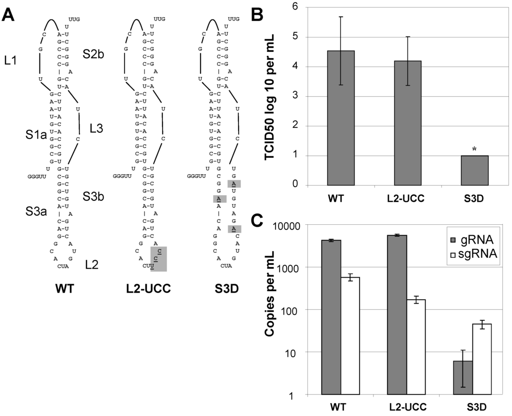 Because the RT-PCR quantification was performed on the supernatant from cells exhibiting CPE and expected to contain representative amounts of cellular gRNA and sgRNA, it is possible that the RT-PCR data could be indicative of differing amounts of gRNA packaged in virions. The reduction in virion-associated gRNA levels could occur if a packaging signal was disrupted. Disruption of a packaging signal would result in fewer complete virions and lower TCID50 and gRNA values as observed for the S3D mutant. Although the efficiency of frameshifting is similar for the L2-UCC and S3D mutants the gRNA levels differ by several log. The stabilization of L2-UCC stem 3 structure and loss of S3D stem 3 structure (see Figure 3) also support the idea that this region may contain a packaging signal.