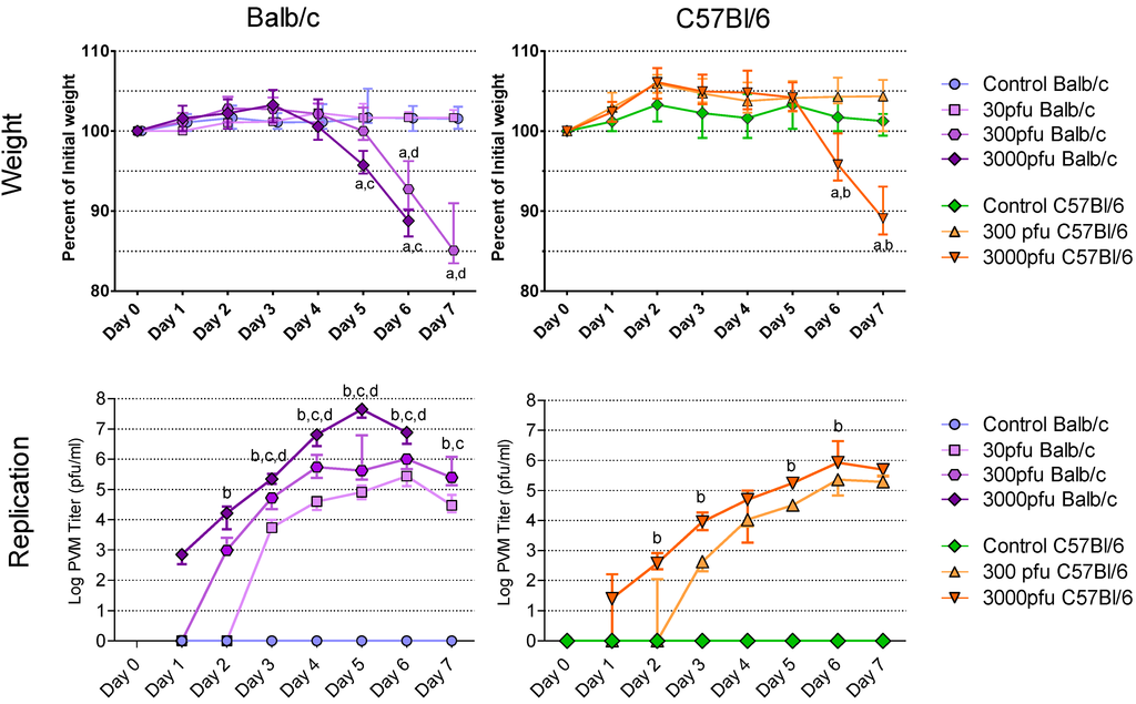 Weight loss and accumulation of virus in the lungs following infection with PVM 15 in Balb/c and C57Bl/6 mice. Five to six week-old Balb/c and C57Bl/6 mice were inoculated with medium, 30 pfu, 300 pfu, or 3000 pfu of PVM 15 and weighed daily for 7 days following infection, and 4 mice per group were sacrificed daily. (A-B) median weight for each group, expressed as a percentage of the starting weight, with error bars indicating the interquartile range. (C-D) median viral load for each group with error bars indicating the interquartile range. a: p <0.05 compared to control group; b. p <0.05 between 3000 and 300 pfu; c: p <0.05 between 3000 and 30 pfu; d: p <0.05 between 300 and 30 pfu. Differences in virus replication with the control groups are not shown.