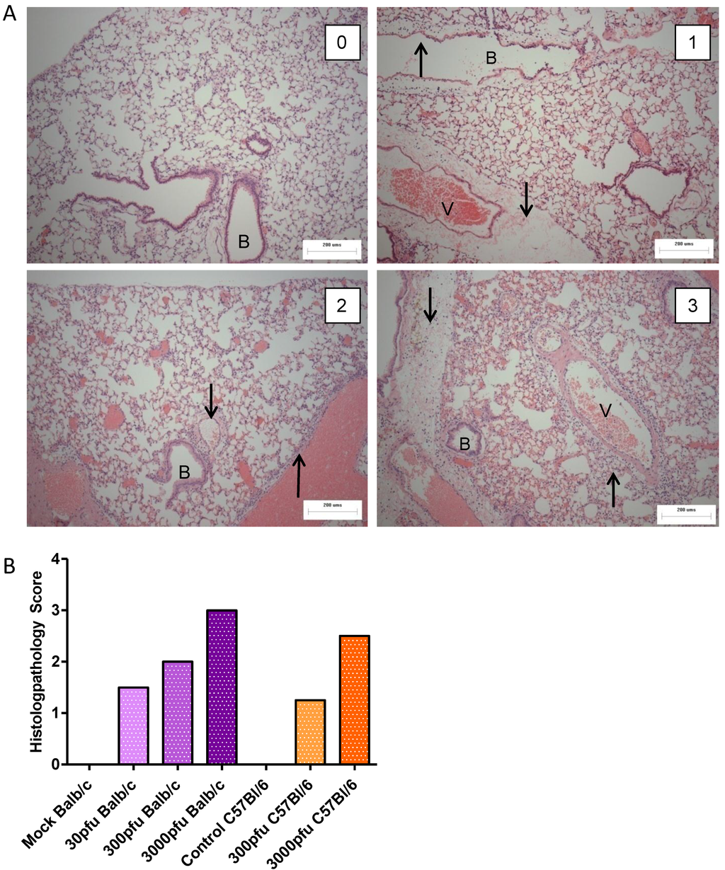 Histopathological analysis of PVM-infected mice. Five to six week-old Balb/c and C57Bl/6 mice were inoculated with medium, 30 pfu, 300 pfu, or 3000 pfu of PVM 15 and lungs were collected from four mice on day 6 p.i. for histopathological analysis. In (A), representative lung sections for animals scoring 0, 1, 2, and 3 are shown, with the upward arrows (↑) indicating infiltrating inflammatory cells and the downward arrows (↓) indicating oedema in the tissue. The bronchiole is labeled with the letter B and the blood vessel with V. Scores were given on the basis of the severity and dissemination of the lesions visible in duplicate lung sections, and median values are shown for each group (B).