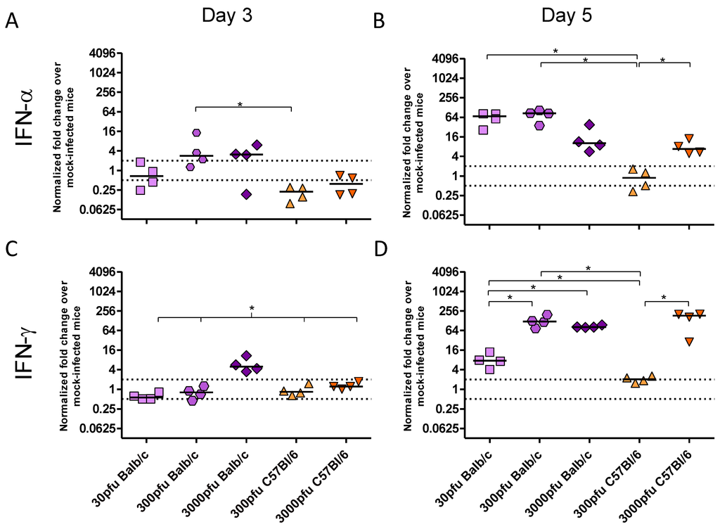 Cytokine expression by Balb/c and C57Bl/6 mice following infection with PVM 15. Five to six week-old Balb/c and C57Bl/6 mice were inoculated with medium, 30 pfu, 300 pfu, or 3000 pfu of PVM 15 and lungs were collected from four mice per group on days 3 (A and C) and 5 p.i. (B and D). Expression levels of IFN-α (A and B) and IFN-γ (C and D) transcripts were calculated using the Bio-Rad analysis software (Bio-Rad CFX Manager Version 2.0), normalized against the expression of both β-actin and GAPDH housekeeping genes, and expressed as the normalized fold-change over mock-infected control animals euthanized on the same day p.i.. Each data point represents a single animal and the line represents the group median. *, p <0.05.
