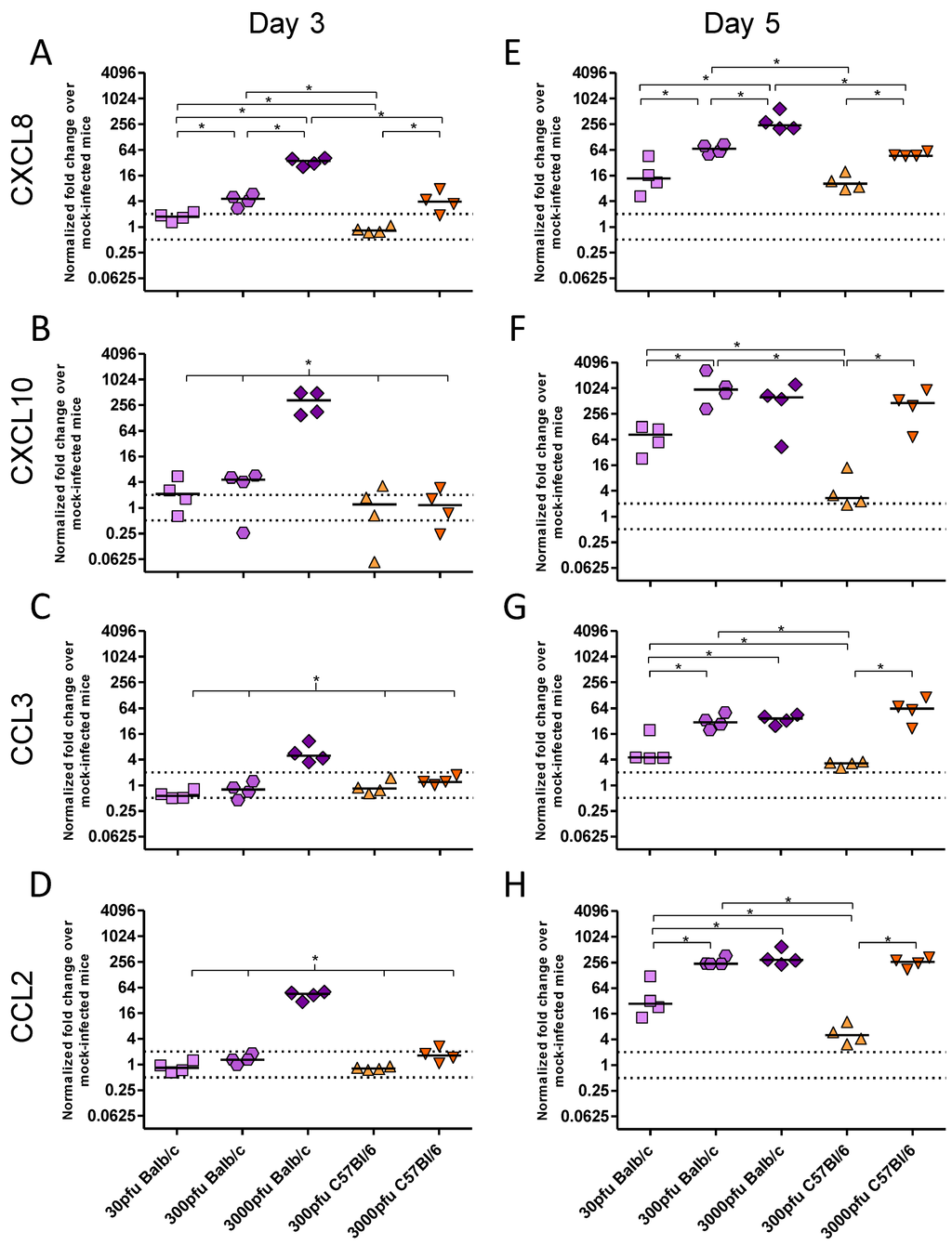 Chemokine expression by Balb/c and C57Bl/6 mice following infection with PVM 15. Five to six week-old Balb/c and C57Bl/6 mice were inoculated with medium, 30 pfu, 300 pfu, or 3000 pfu of PVM 15 and lungs were collected from four mice per group on days 3 (A–D) and 5 p.i. (E–H). The expression levels of CXCL8 (A and E), CXCL10 (B and F), CCL3 (C and G), and CCL2 (D and H) were calculated using the Bio-Rad analysis software (Bio-Rad CFX Manager Version 2.0), normalized against the expression of both β-actin and GAPDH housekeeping genes, and expressed as the normalized fold-change over mock-infected control animals euthanized on the same day p.i.. Each data point represents a single animal and the line represents the group median. *, p <0.05.