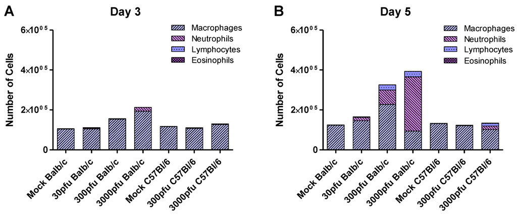 In order to determine the biological effects of the proinflammatory mediators reported above, we examined cell populations infiltrating the lungs of the infected mice (Figure 5). As expected from the earlier upregulation of proinflammatory mediators seen in Balb/c mice, this strain showed an earlier and stronger influx of cells into the lungs that was dominated by neutrophils. The degree of neutrophilia appeared to be dose-dependent in the Balb/c strain on day 5 p.i., while the lethal doses showed similar levels of lymphocyte infiltration. The C57Bl/6 mice, on the other hand, had little influx of cells by day 5 p.i., even at the highest dose of 3000 pfu. Comparing the two sublethal doses, the 30 pfu Balb/c group showed a low level of inflammation by day 5 p.i., while the 300 pfu C57Bl/6 group had essentially normal lung washes. There were few to no eosinophils in response to PVM 15 in either strain at any dose. In contrast, Domachowski et al. demonstrated that in response to PVM J3666, Balb/c mice showed a prominent eosinophilia, as early as 3 days after inoculation, while at later time points cell infiltration was dominated by neutrophils. In their study they did not find any up regulation of eosinophilic chemoattractant IL-5, CCL2, CCL11 or CCL5, but CCL3 was up regulated. Thus, pulmonary eosinophilia and production of CCL3 are prominent responses to infection with PVM J3666 [29].