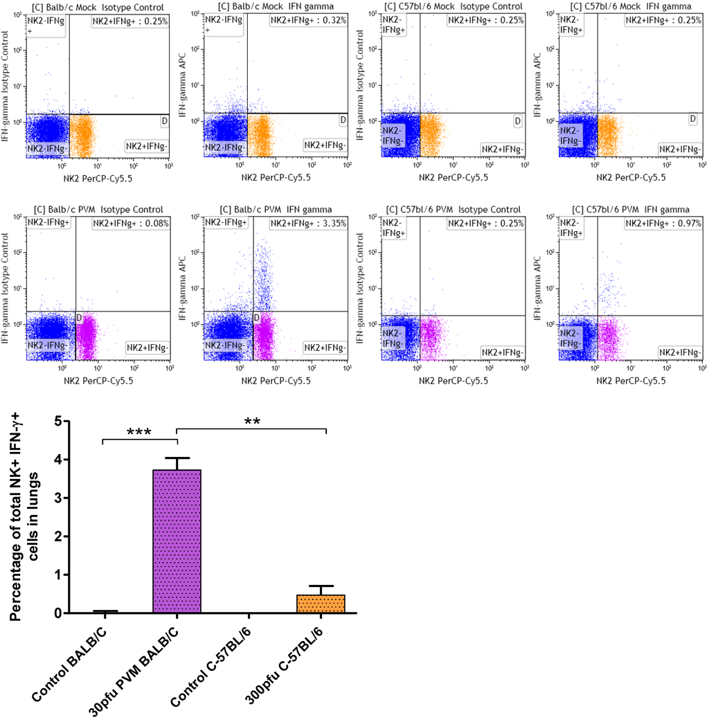 Percentage of IFN-γ secreting NK cells in lungs of Balb/c and C57Bl/6 mice in response to PVM infection. Five to six week old-mice were inoculated with medium (control), or 30 pfu (Balb/c), or 300 pfu (C57Bl/6) of PVM 15 and sacrificed on day 6 p.i.. Cells collected from pooled lungs of five animals were stained with anti-CD8a-FITC, anti-CD3-PE, anti-CD4-FITC, anti-CD335(NKp46)PerCP-CyTM 5.5 for surface markers, followed by permeabilization and fixation with BD Cytofix/CytopermTM Plus and staining with anti-IFN-γ-APC. Flow cytometry was performed using a FACS Calibur (BD Biosciences), and data analysis was performed using Kaluza software. Median values with interquartile range are shown. **, p <0.01; ***, p <0.001.