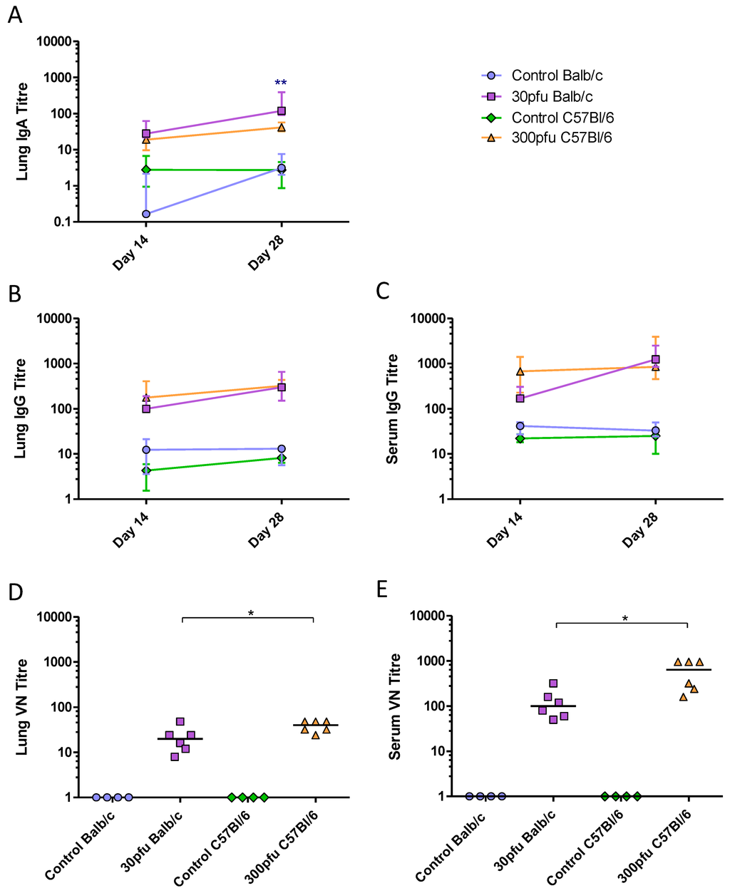 PVM-specific antibody response in the serum and lungs. Five to six week-old Balb/c and C57Bl/6 mice were inoculated with medium, 30 pfu (Balb/c) or 300 pfu (C57Bl/6) of PVM 15 and sacrificed on days 14, 28, and 42 p.i.. Time course of (A) lung IgA, (B) lung IgG, and (C) serum IgG, represented as the group median with vertical lines indicating the interquartile range. VN titres on day 28 in lung (D) and serum (E). Each data point represents a single animal and the line represents the group median. *, p <0.05; **, p <0.01.
