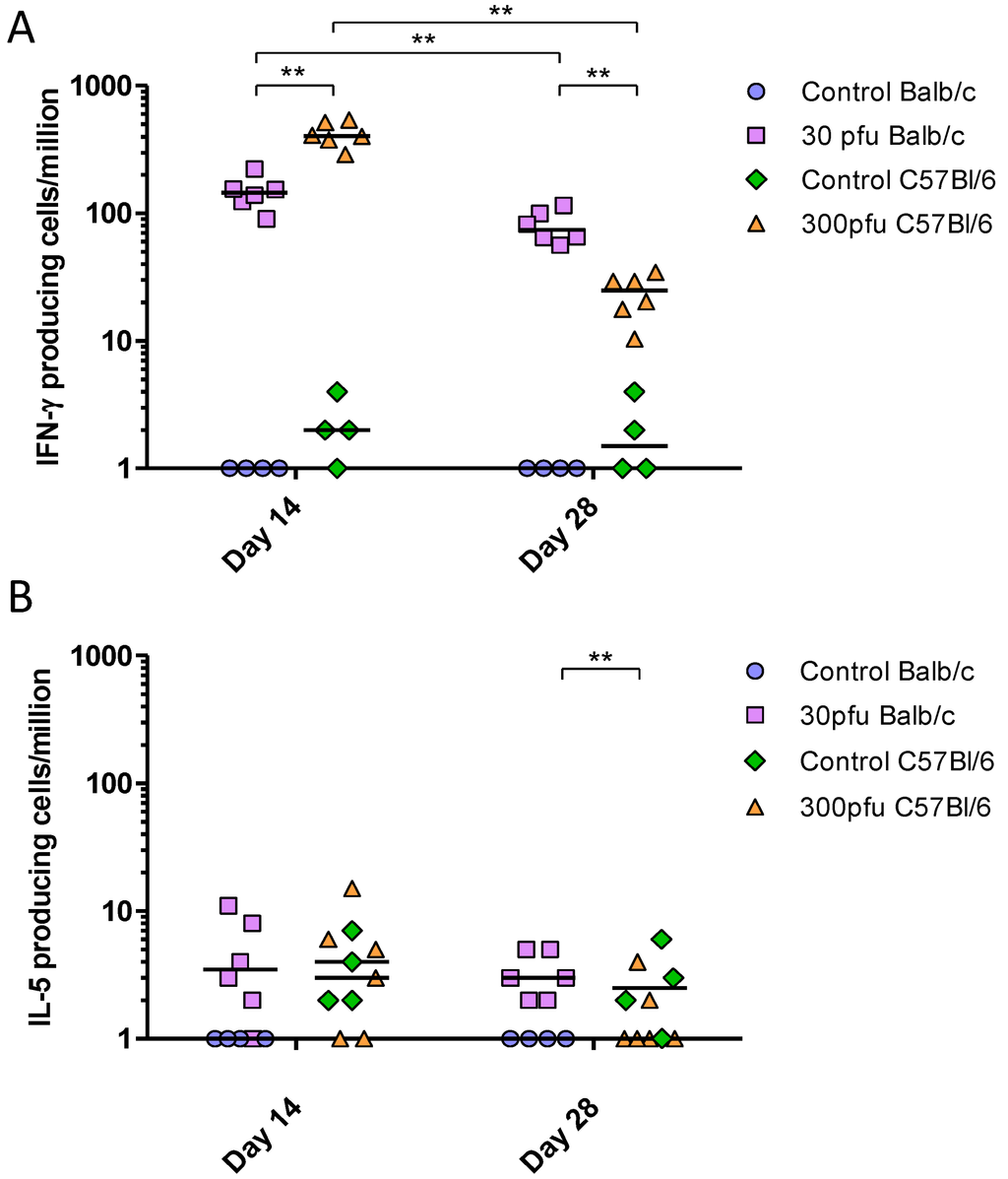 PVM-specific IFN-γ-secreting (A) and IL-5-secreting (B) splenocytes following in vitro restimulation with PVM-infected cell lysates. Five to six week-old Balb/c and C57Bl/6 mice were inoculated with medium, 30 pfu (Balb/c) or 300 pfu (C57Bl/6) and sacrificed on days 14, 28, and 42 p.i.. The PVM-specific response is calculated by subtracting the number of cytokine-secreting cells restimulated with mock-infected cell lysates from those restimulated with PVM-infected lysates. The data points represent individual animals, with the median indicated by a line. **, p <0.01.