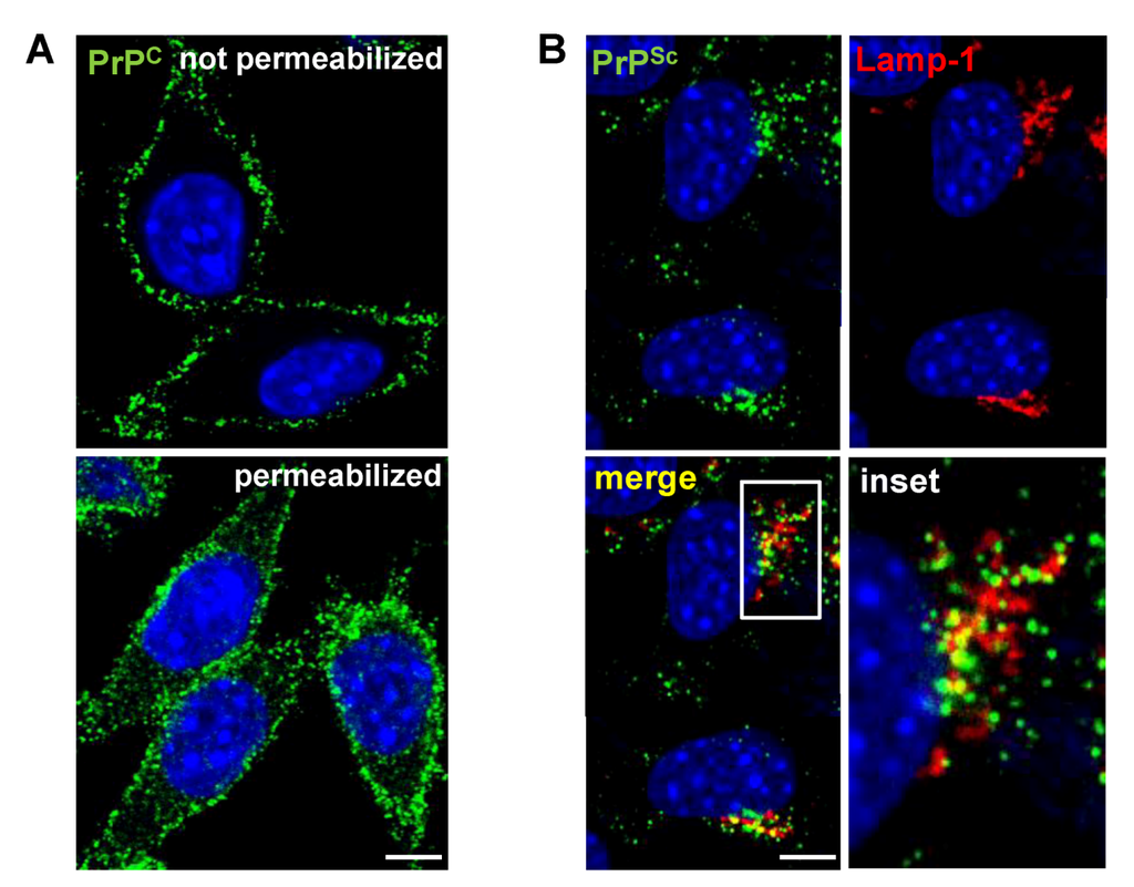 Localization of PrPC and PrPSc in L929 fibroblast cells. (A) Indirect immunofluorescence (IF) staining of cellular PrP (green) in uninfected L929 cells. PrPC predominantly resides at the cell surface with some intracellular localization. (B) Detection of PrPSc in L929 cells persistently infected with prion strain 22L by IF. In contrast to PrPC, PrPSc (green) primarily localizes intracellularly and partially co-localizes with the lysosomal marker Lamp-1 (red). (A,B) Nuclei were counterstained with Hoechst (blue). Scale bar: 5 µm.