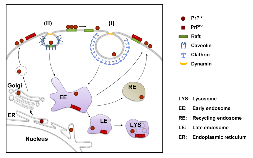 PrPC is rapidly and constitutively endocytosed from the plasma membrane [53,54]. External stimuli such as the binding of copper or stress-inducible protein 1 (STI1) to PrPC can stimulate its internalization [55]. Endocytosis occurs via a dynamin-dependent pathway. PrPC transits through Rab5 positive early endosomes (EEs) before it is degraded via the endosomal/lysosomal pathway [54,56,57,58,59]. Alternatively, endocytosed PrPC can transfer rapidly and directly to recycling endosomes (RE) and back to the cell surface [54,56,60,61]. It has been proposed that the dynamin-dependent endocytosis of PrPC is a GPI-anchor independent event mediated by the interaction of other proteins with specific domains within PrPC [56].