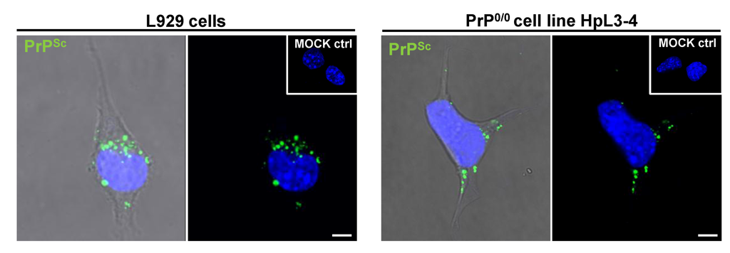 Non-neuronal cells and PrP-deficient cells take up PrPSc. Brain homogenate from mice infected with the 22L prion strain is taken up by L929 fibroblast cells (left panel) and PrP-deficient HpL3-4 cells (right panel). Cells were incubated with infected brain homogenate for 18 hours prior to fixation, permeabilization, guanidine hydrochloride treatment and immunofluorescence staining. Cells incubated with uninfected brain homogenate (MOCK ctrl) served as control for specific detection of PrPSc. PrPSc uptake is observed in both fibroblast cells and PrP-deficient cells. Monoclonal anti-PrP antibody: 4H11. Nuclei were counterstained with Hoechst (blue). Scale bar: 5 µm.