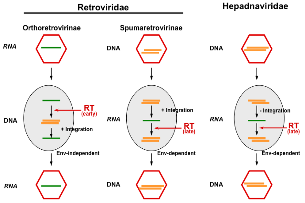 The principal replication strategies of viruses making use of reverse transcription. While orthoretroviruses are RNA viruses, which replicate through a DNA intermediate and require integration for reproduction, hepadnaviruses are DNA viruses replicating through an RNA intermediate without the integration of their genome. FVs appear to functionally bridge these pathways, since they reverse transcribe (at least to a significant extent) late in replication (like hepadnaviruses) and must integrate their genome into the host cell genome (like orthoretroviruses). Furthermore, cellular exit of FV particles depends on their cognate glycoprotein as in hepadnaviruses, while budding of orthoretroviral particles is Env-independent (Figure adapted from [3]). RT, reverse transcriptase.