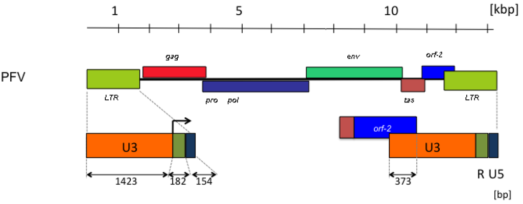 The length of the LTRs is a striking feature of FV genomes (Figure 2). The U3 regions contribute to these by approximately 85%. In particular, the LTRs of FVs from primates have extraordinarily long U3 regions of more than 1,400 bps [41]. Approximately one third of the U3 regions of primate FVs are protein-encoding bet sequences (Figure 2). The possible functions of the sequence remainder, aside from relatively short DNA motifs required for the regulation of gene expression [43,44], are inadequately defined and need further characterization. Because the rest of the genome has protein-encoding and cis-acting RNA or DNA functions, or both [2,45,46], the deletions in the U3 LTR region may be tolerated by virus replication in cell culture [41,42]. Such deletions were actually found upon obtaining proviral FV molecular clones from higher primates [47], and the detection of the undeleted LTRs [41,48] delayed their initial identification [49,50].