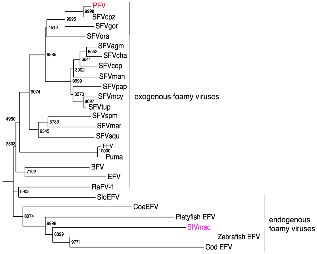 Phylogeny of current endogenous and exogenous FV pol amino acid sequences (from the active center-specifying integrase sequences and comprising 142 codons). A neighbor-joining tree was calculated by using the Maximum Composite Likelihood method with a bootstrap test of 10,000 replicates. BFV, bovine FV (NP_044929.1); EFV equine FV (NP_054716.1); PFV, prototypic FV (in red) (Y07725.1); SFVcpz, SFV from chimpanzee (CCP47057); SFVgor, SFV from gorilla (AY195688.1); SFVora, SFV from orangutan (CAD67562); SFVagm, African green monkey (Cercopithecus aethiops) FV (YP_001956722.2); SFVcha, SFV from Chlorocebus aethiops (CAM34599); SFVcep, SFV from Cercopithecus pygerythrus (AAV92627); SFVman, SFV from mandrill (ADO65890.1); SFVpap, SFV from Papio (CAM34655); SFVmcy (previously SFVmac) from Macaca mulatta, SFV from Macaca cyclopis (CAA41394.1); SFVtup, SFV from Tupaia [155] (AGN49359); SFVspm, SFV from spider monkey (ABV59399.1); SFVmar, SFV from marmosets (ADE06000.1); SFVsqu, SFV from squirrel monkeys (ADE05995.1); FFV, feline FV (NP_056914); Puma, FV from Puma concolor (AGC11913); RaFV-1, FV from the bat Rhinolophus affinis (AFK85015); SloEFV, endogenous FV from sloths (Katzourakis et al., 2009); CoeEFV, endogenous FV in the coelacanth (Latimeria) genome (JX006241.1); platyfish EFV, endogenous FV from platyfish (M. Schartl, personal communication); zebrafish EFV, zebrafish (M. Schartl, personal communication); and Cod EFV, codfish (M. Schartl, personal communication) genomes; integrase encoding sequences of the macaque simian immunodeficiency virus (SIVmac in magenta) (AAC57420.1) served as the outlier; the endogenous FV sequence from aye-aye (PSFVaye) [156] was not incorporated, because integrase sequences are not available.