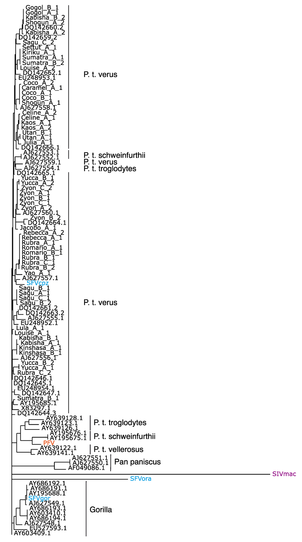 However, a more detailed evaluation, including DNA sequences, which became only available recently [48,50], reveals that the SFVs from chimpanzees present a wider sequence spectrum than the SFVs from gorillas (Figure 5). This finding represents only a very indirect support for the phylogeographic origin of FV sequences, because the actual geographic origin of the gorilla whose SFV sequence was reported first [48,50] is dubious. All other SFVgor sequences [48] were derived from animals stemming from a more limited area compared to the FVs derived from chimpanzees. These data are best compatible with the assumption of a strain-specific transmission pattern according to mother-to-child transmission and social groups [30]. In addition, they reflect behavioral differences between chimpanzees and gorillas, e.g., a more aggressive behavior of the former. Surely, more sequencing data from great ape FVs should reveal a better evolutionary relationship of FVs. However, PFV to SFV being almost identical in P.t. schweinfurthii points to these chimpanzee subspecies as a potential transmitter of this virus.