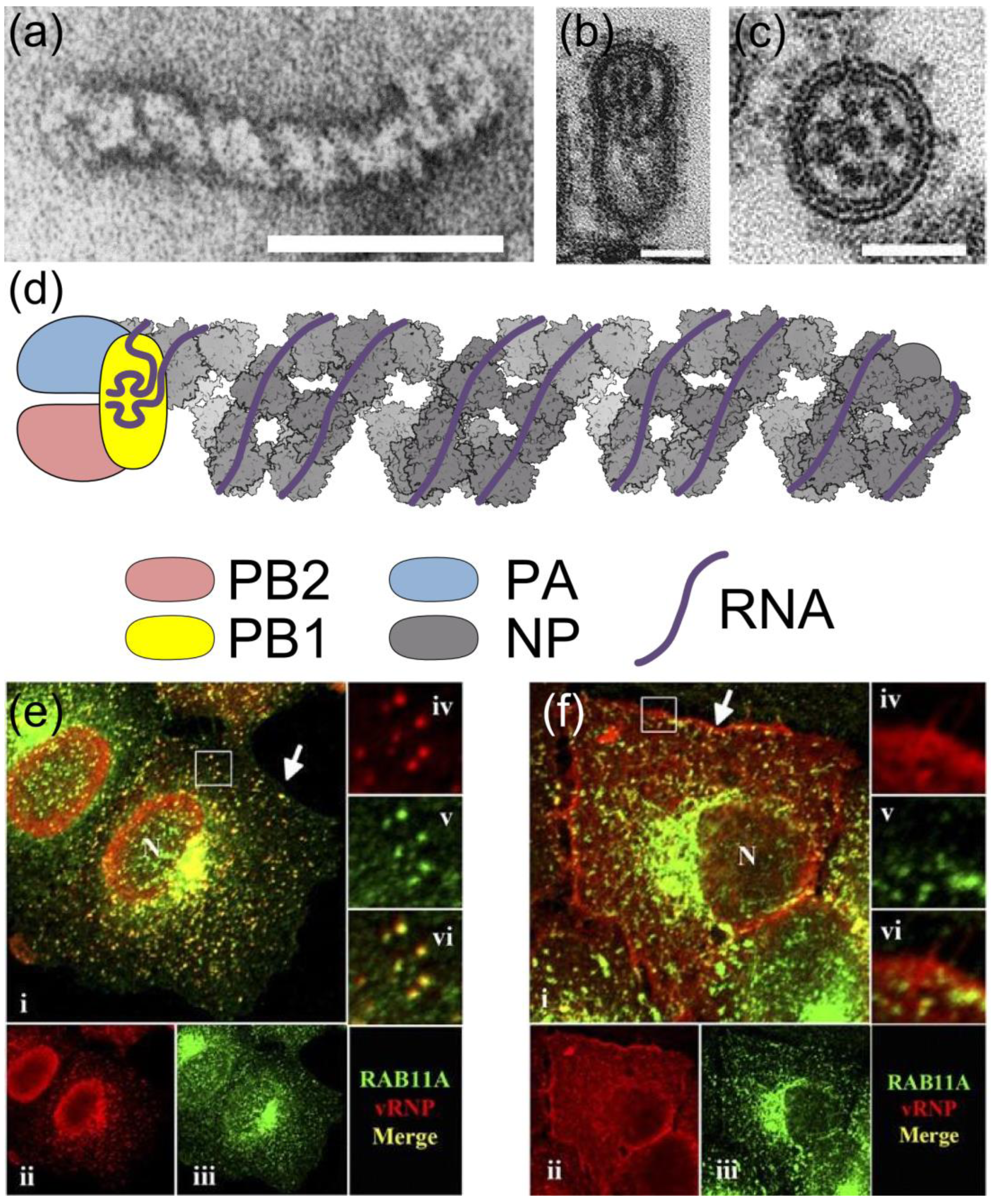 The influenza A virus ribonucleoprotein (RNP). The negative-sense RNA of the influenza A virus genome is divided into eight segments, each of which is encapsidated into an RNP. Electron micrographs showing (a) a negatively-stained RNP and (b) longitudinal and (c) transverse views of budding virions; scale bars are 50 nm. In (b) and (c) a complex of eight RNPs is visible as dark rods or dots. (d) Diagram of RNP structure. The NP backbone is based on reference [9] (PDB 4BBL, illustrated using the Python Molecular Viewer [14]); the polymerase and viral RNA, including the terminal promoter structure bound by PB1, are shown schematically. (e, f) Localisation of RNPs in an infected cell. Infected cells were fixed at 7 h (e) or 11 h (f) post-infection, and labelled with antibodies against RNPs (red, ii and iv) and the Rab11 isoform Rab11A (green, iii and v). The selected regions are enlarged 3× in frames iv, v and vi. As the infection progresses RNPs are exported from the nucleus (N) and associate with Rab11 in a perinuclear region for transport across the cytoplasm, then dissociate from Rab11 at the plasma membrane (arrow). Images in (a) reprinted from [15] with permission from Elsevier; in (b, c) adapted by permission from Macmillan Publishers Ltd: Nature [16], copyright (2006) and in (e, f) reproduced from [17] with permission from American Society for Microbiology.
