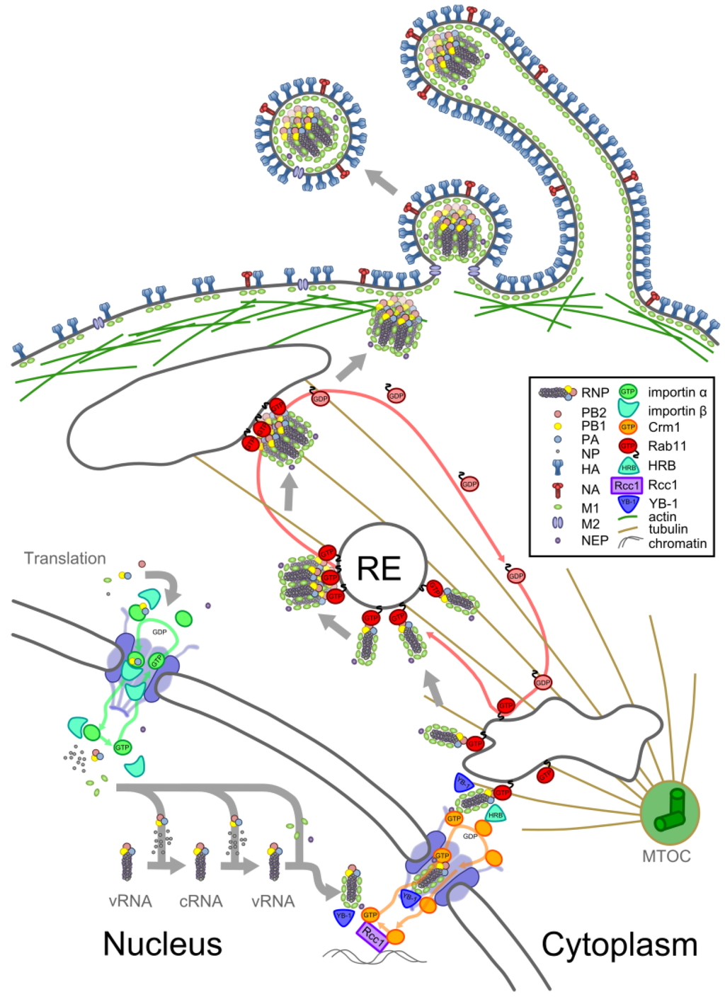 Transport of an RNP from synthesis to packaging. Schematic showing the synthesis and transport of an RNP within an infected cell. Viral proteins are translated in the cytoplasm and imported into the nucleus (bottom left). Here, some encapsidate replicating viral RNA, forming RNPs, and others bind to these newly formed RNPs. Assembled RNPs are exported from the nucleus and attach to recycling endosomes (RE) at the nuclear periphery. On REs they associate to form complexes and are transported away from the microtubule organising centre (MTOC) to the cell surface (top). At the cell surface, complexes of RNPs are packaged with other viral proteins into virions, which can be spherical or filamentous in morphology. See text for further details.