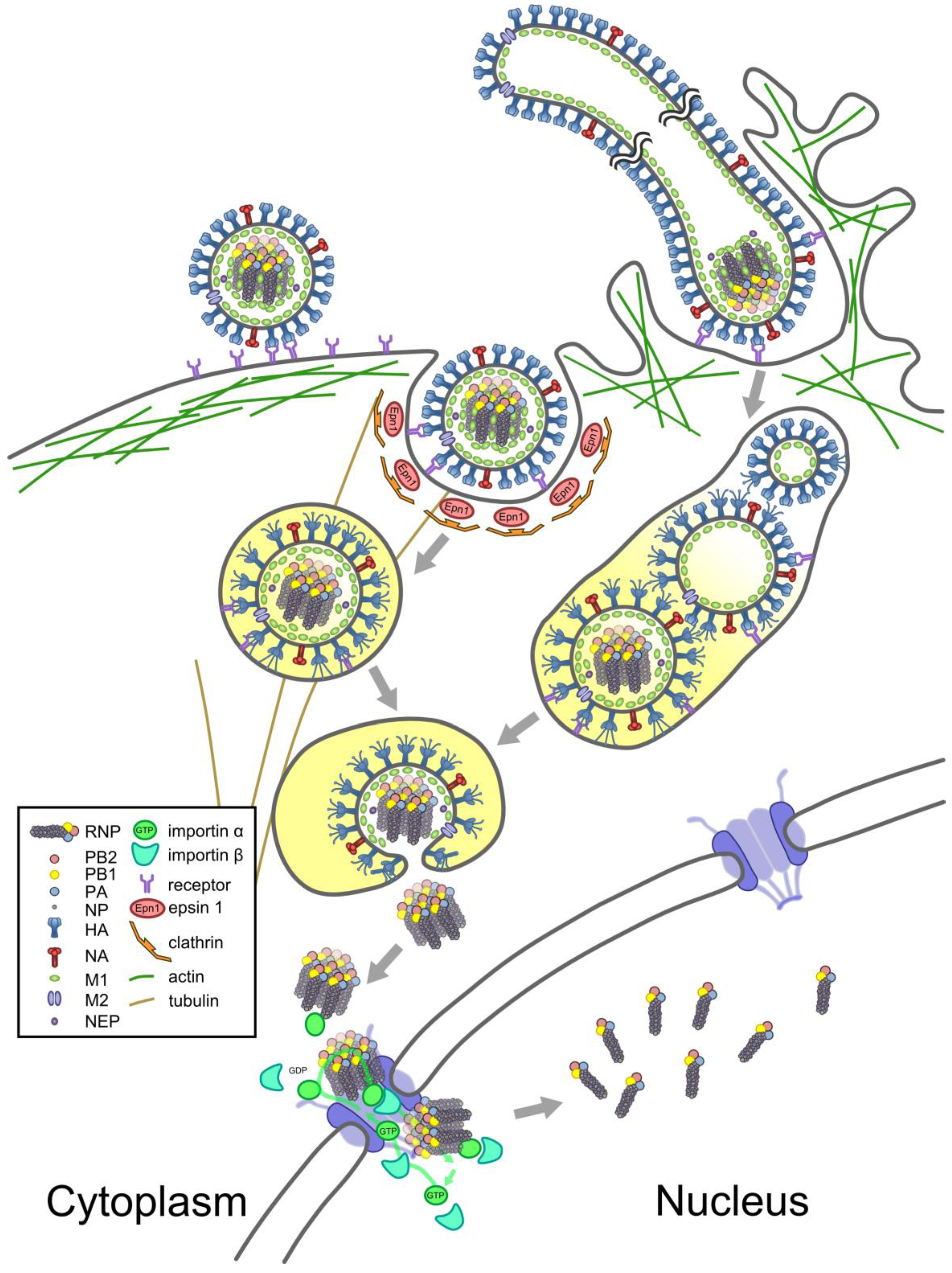 The entry of RNPs into newly-infected cells and their transport into the nucleus is illustrated in Figure 3 and described below.