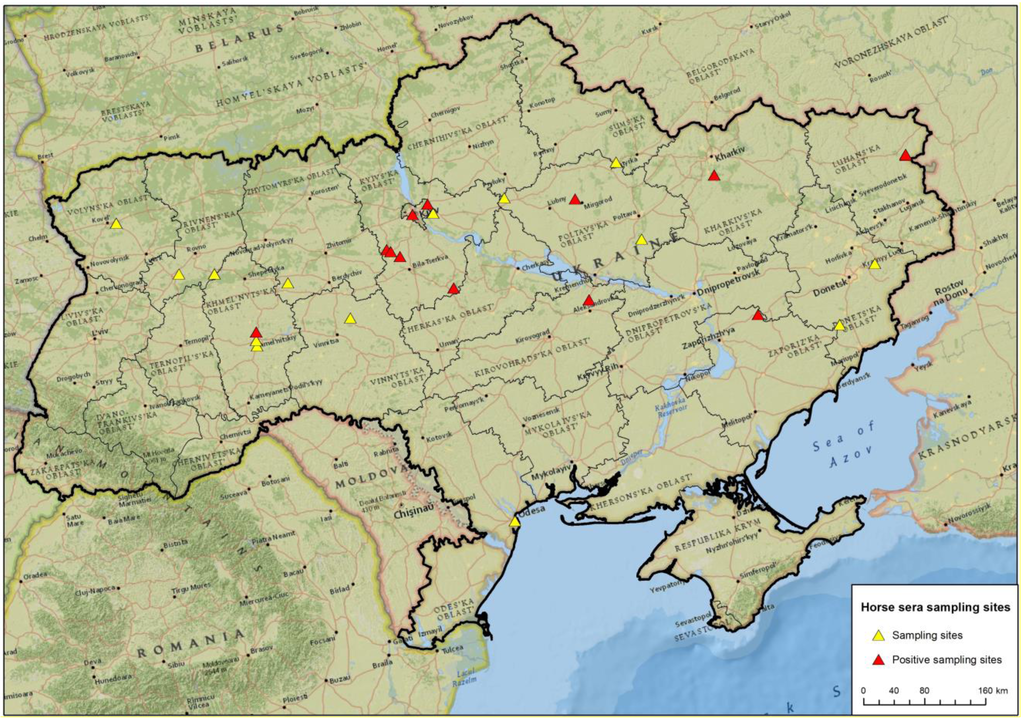 This is the first up-to-date report indicating WNV infections prevalence in horses in Ukraine, and these results provide evidence of widespread WNV circulation in this country. The results will help to determine the risk of infection for humans and to control WNV transmission. Surveillance studies in humans, vectors and animals are needed to better define endemic areas.