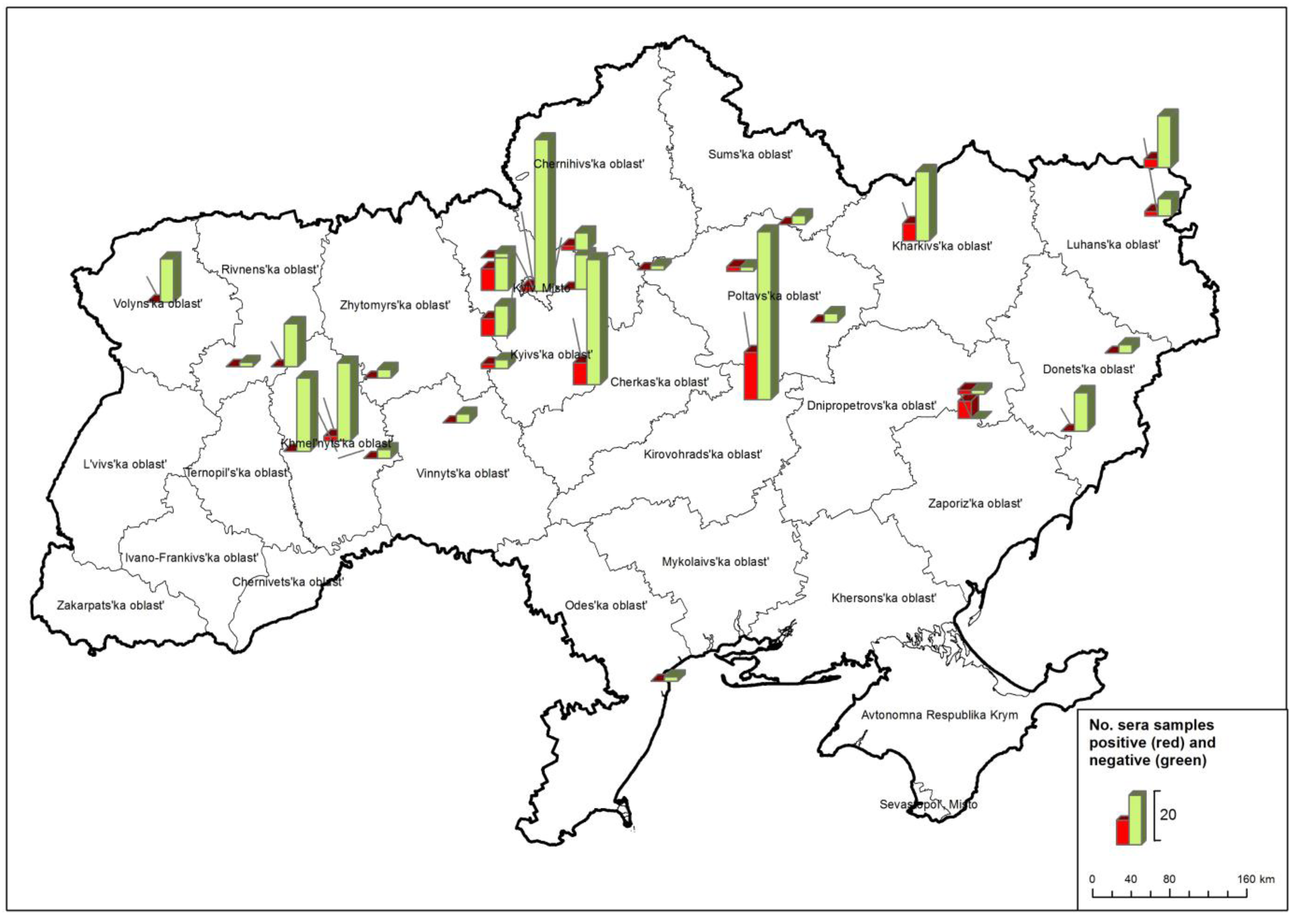 | Ukraine | Region | by ELISA | comp. ELISA negative | comp. ELISA reactive (doubtful or positive) | ELISA prevalence |