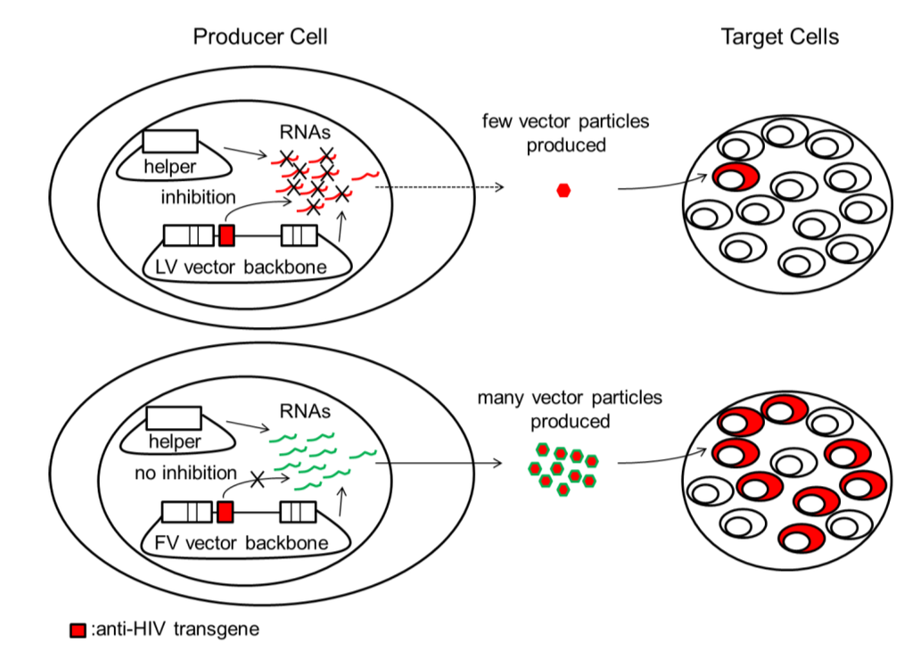 FV vectors offer several important advantages over other retroviral vectors for HIV gene therapy. They can package large transgene cassettes and they have a desirable safety profile. Although FV vectors are potentially suited for broad use in HSC gene therapy, they may prove particularly useful in the treatment of HIV/AIDS. Lower sequence and functional homology between FV vectors and HIV reduces the probability of recombination with and/or mobilization by endogenous HIV, and FV vectors avoid the reduced titers observed in LV vectors carrying some anti-HIV transgenes. FV vector platforms may therefore better avoid complications in vector design and more efficiently produce safer, high titer anti-HIV-transgene containing vector than LV vector systems. FV anti-HIV vectors have been developed by several groups and have shown great promise in preclinical studies. Additional studies to improve FV vector safety by modifying vector components, and continued development of FV vectors with potent anti-HIV transgene combinations should lead to FV vectors with excellent clinical potential.