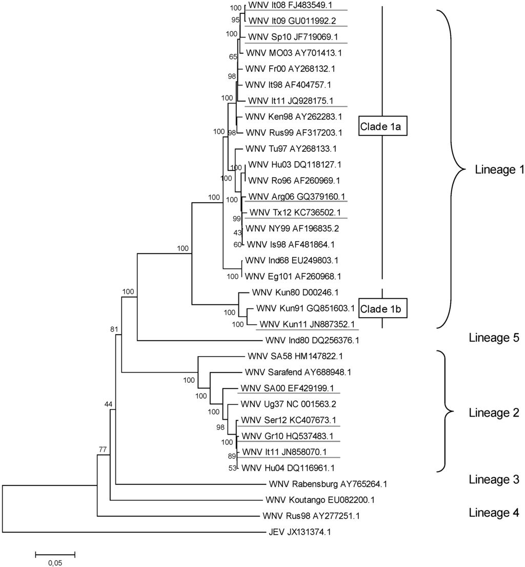 West Nile Virus (WNV) genetic diversity, evaluated using genetic alignment of complete genomic sequences. GenBank accession numbers are indicated on the tree branches of each virus; the first two or three letters stand for the country or the USA state reporting WNV (It = Italy, Sp = Spain, Mo = Morocco, Fr = France, Ken = Kenya, Rus = Russia, Tu = Tunisia, Hu = Hungary, Ro = Romania, Arg = Argentina, Tx = Texas, NY = New York, Is = Israel, Ind = India, Eg = Egypt, Kun = Kunjin Australia, SA = South Africa, Ug=Uganda, Ser = Serbia, and Gr = Greece) and the numbers indicate the year of isolation (96 = 1996, 10 = 2010). Japanese encephalitis virus (JEV), a closely related flavivirus, was used as an outgroup. The rooted phylogenetic tree was constructed using neighbor-joining with Jukes-Cantor parameter distances (scale bar) in MEGA (MEGA software, version 5.2 [25]). A bootstrapped confidence interval (1,000 replicates) and a confidence probability value based on the standard error test were also calculated using MEGA. The WNV strains responsible for recent human or equine outbreaks are underlined. The complete sequences of the most recent Romanian and Russian lineage 2 variants are not available, but at least two introduction events of lineage 2 strains have occurred in Europe: divergent lineage 2 strains have been observed in Romania/Russia and Hungary/Greece/Italy/Serbia/Austria [26].