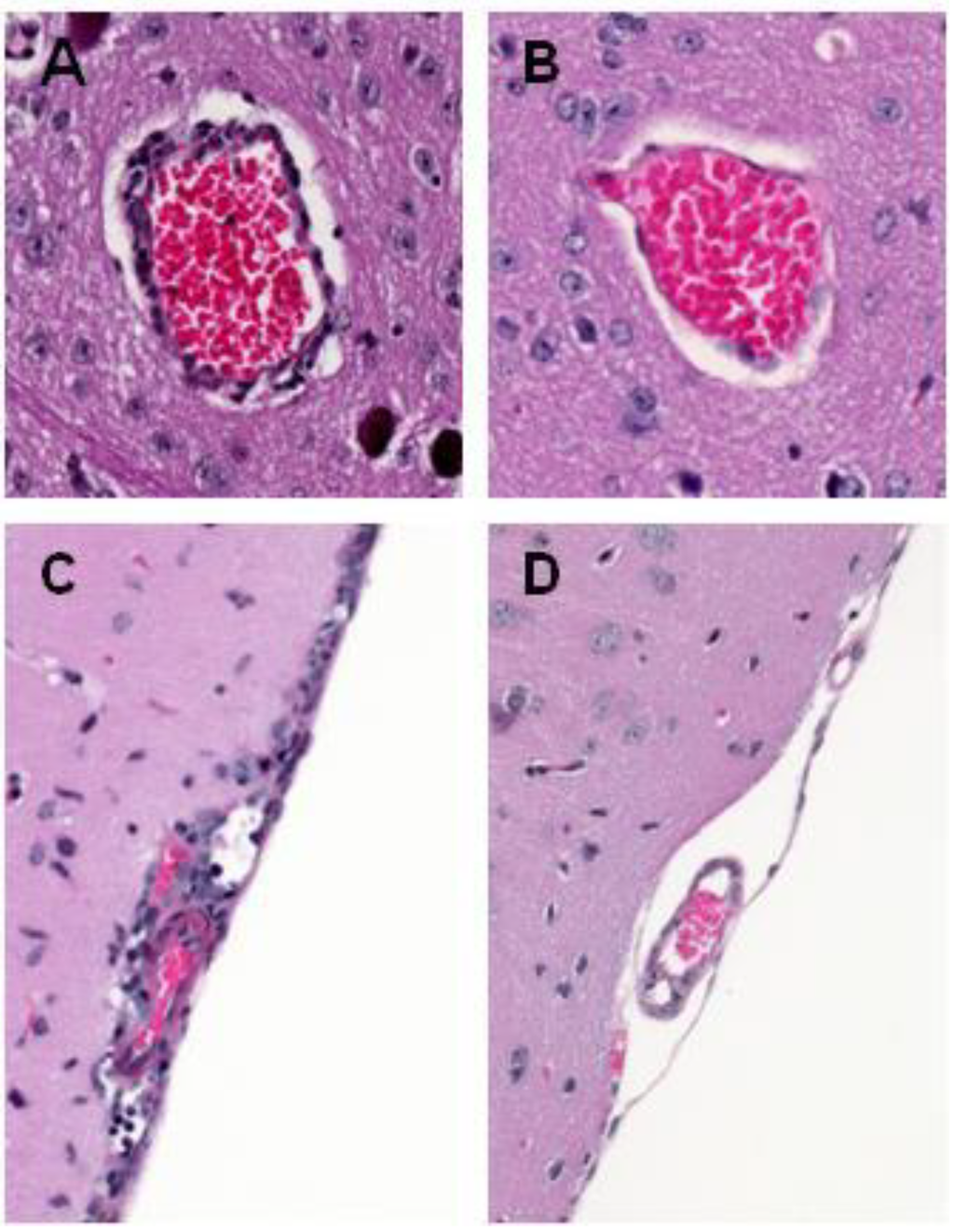 Representative histologic lesions in the brains of mice infected with WNV. (A) Haematoxylin- and eosin-stained section showing perivascular infiltrates of lymphocytesand macrophages (WNV infection) (×20 magnification); (B) Haematoxylin- and eosin-stained section showing a control blood vessel (without perivascular infiltrates, Control) (×20 magnification); (C) Haematoxylin- and eosin-stained section showing mild meningitis (WNV infection) (×20 magnification). (D) Haematoxylin- and eosin-stained section showing control meninges (without infiltrate, Control) (×20 magnification).