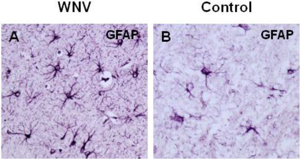 Neuroinflammation in mice infected with WNV. (A) A high level of astrocyte reactivity was observed in WNV-infected mice using paraffin-embedded tissue stained for the astrocyte GFAP marker. Astrocytes displayed modified morphologies and hypertrophic cell bodies (×20 magnification); (B) A low level of astrocyte reactivity was observed in non-infected mice.