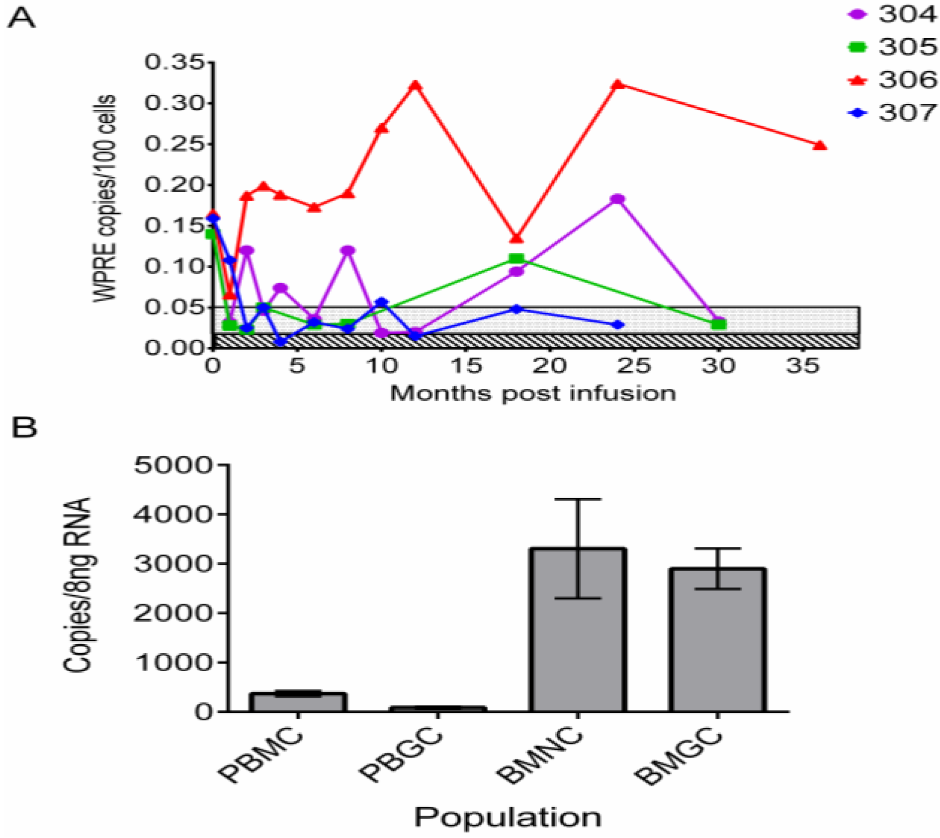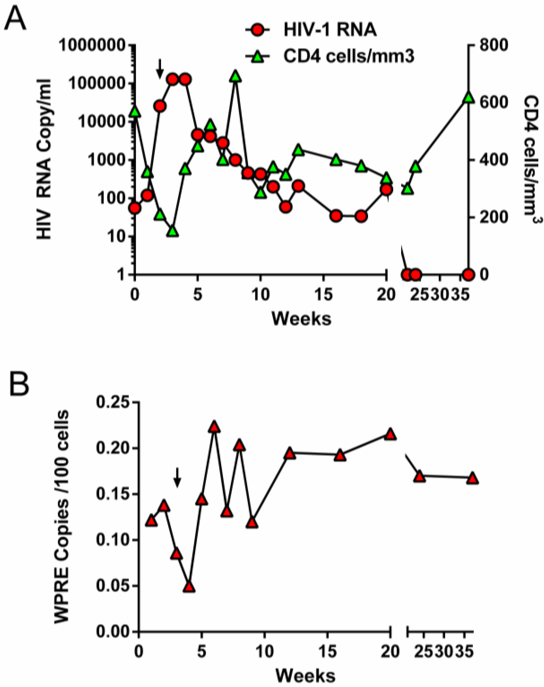 Analytical Treatment interruption. One subject (UPN0306) was aviremic by standard of care assay (<50 gc/mL) with CD4 counts > 500 cells/µL and had detectable lentiviral vector sequences cells (by WPRE PCR assay) within the peripheral blood and underwent an ATI after informed consent according to City of Hope Institutional Review Board approved protocols. The anti-retroviral treatment was discontinued and the subject was examined every other week with collection of laboratory samples during the entire treatment interruption. cART was resumed at 21 days after initiation of ATI following viremia >100,000 HIV copies/mL and CD4 counts < 200 cells/µL.