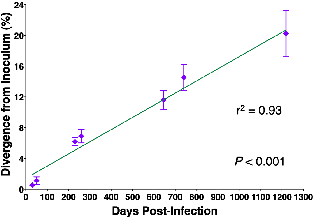 EIAV envelope divergence over time. Genetic distance calculations of amino acid sequence divergence of longitudinal isolate Envs from the inoculum Env sequence were calculated and plotted as a function of time. Linear regression (line) analysis revealed a significant linear relationship between the two variables (Figure modified from original published in Craigo et al. []).