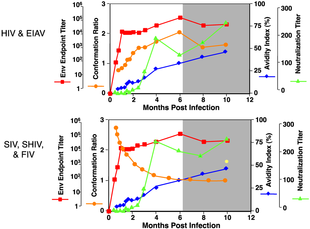 Schematic representation of lentiviral immune maturation. Development of mature immunity (grey-shaded box) occurs by 6–8 months post-infection. Red, reciprocal endpoint titer; Orange, conformational ratio; Blue, avidity index; Green, reciprocal neutralization titer (Figure modified from original in Montelaro et al. []).