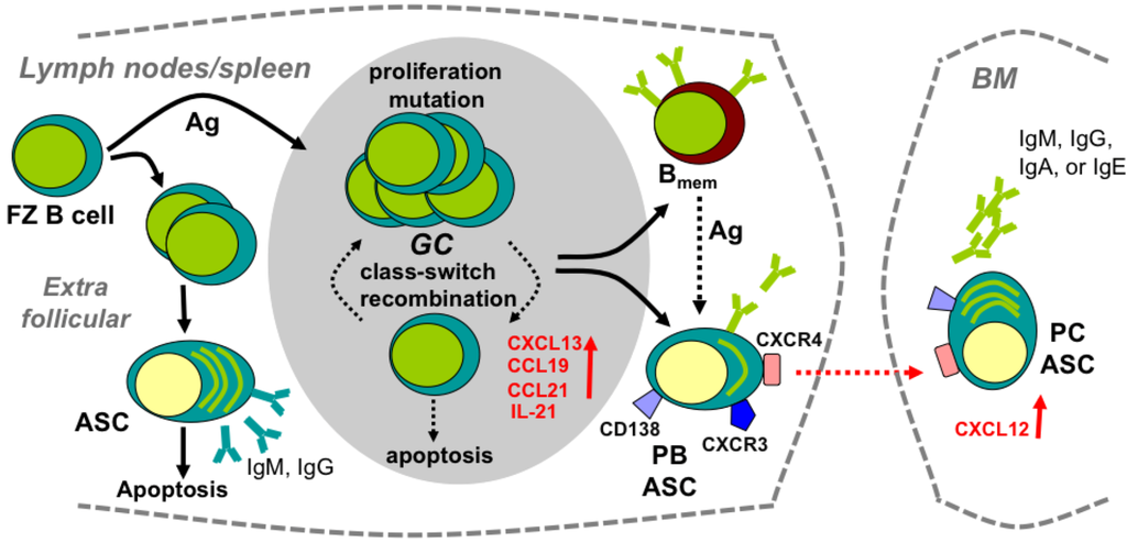 Following acute viral infection or immunization, antigen (Ag) in lymph nodes induces naive B cells to proliferate and migrate to extrafollicular foci or lymphoid follicles (Figure 1) [32,33]. Extrafollicular B cells, which differentiate into short-lived ASC, provide an early source of low-affinity Ab. By contrast, B cells migrating to lymphoid follicles in response to the CXCR5 ligand CXCL13, and CCR7 ligands CCL19 and CCL21, form germinal centers (GC) (Figure 1); these highly dynamic structures consist primarily of activated B cells, follicular dendritic cells (FDC) and T follicular helper (TFH) cells. FDC are radiation-resistant stromal cells that retain intact surface Ag and present Ag to the GC-invading B cells [34]. FDC further support GC formation by secreting CXCL13, a major chemoattractant of GC B cells and TFH cells, as well as IL-6 and B cell activating factor (BAFF), both of which promote GC reaction [34]. Interleukin (IL)-21 producing TFH cells constitute a T cell subset essential for GC maintenance and regulation of GC B cell clonal expansion and affinity maturation [35,36]. GC reactions lead to B cell differentiation into two distinct Ag specific populations: ASC and non-Ab-secreting memory B cells (Bmem) [37]. As infections resolve, ASC egress into the circulation and give rise to long-lived plasma cells (PC) residing primarily in bone marrow (BM) [32,33]. ASC emigration from lymphoid follicles is associated with CXCR5 and CCR7 downregulation, resulting in reduced responsiveness to their respective ligands CXCL13 and CCL19/CCL21, which are prominently expressed in lymphoid organs [32,38,39]. By contrast, both CXCR3 and CXCR4 are upregulated during ASC differentiation [27,40], with CXCR4–CXCL12 interactions mediating homing to, and retention within, BM [40,41]. ASC comprise a phenotypically and functionally heterogeneous population of Ag-experienced B cells committed to Ab secretion; they include migration and proliferation-competent, major histocompatibility complex (MHC) class II expressing pre-PC at various differentiation stages, termed plasma blasts (PB), as well as terminally differentiated, sessile, non-dividing PC dedicated to high constitutive Ab secretion [32,33,41,42]. Sessile long-lived PC within the BM maintain protective serum Ab against re-infection [41,42,43,44] with an estimated half-life of anti-viral Ab responses in humans ranging from ~50 to 200 years [45]. The non-Ab-secreting Bmem are largely retained in lymphoid organs, but are also found in circulation. Ag re-encountered by Bmem mediate rapid transition into ASC by both GC-dependent and independent pathways [42,44,46].