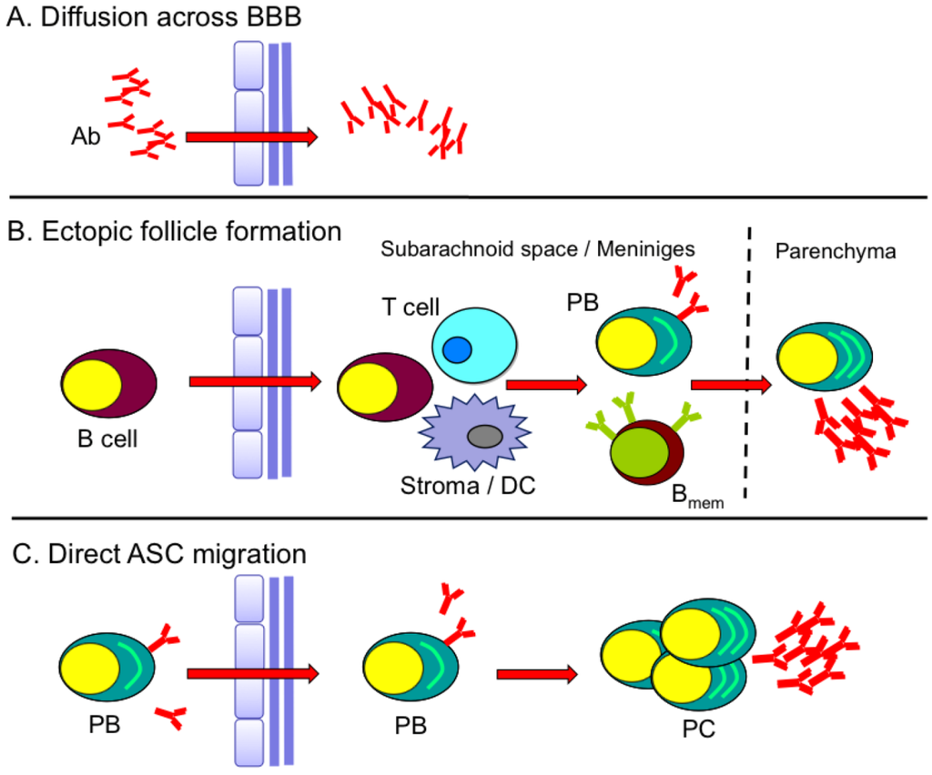 Models for sustained humoral response in CNS. (A) Direct penetration of serum Ab into the CNS when blood–brain barrier (BBB) integrity is compromised. (B) Formation of ectopic follicle-like structures (B cells, T cells, stroma/dendritic cells (DC)) within the subarachnoid space or meninges giving rise to plasma blast (PB) and memory B cells (Bmem). (C) Migration of peripherally activated PB into the CNS that further differentiate into plasma cells (PC).
