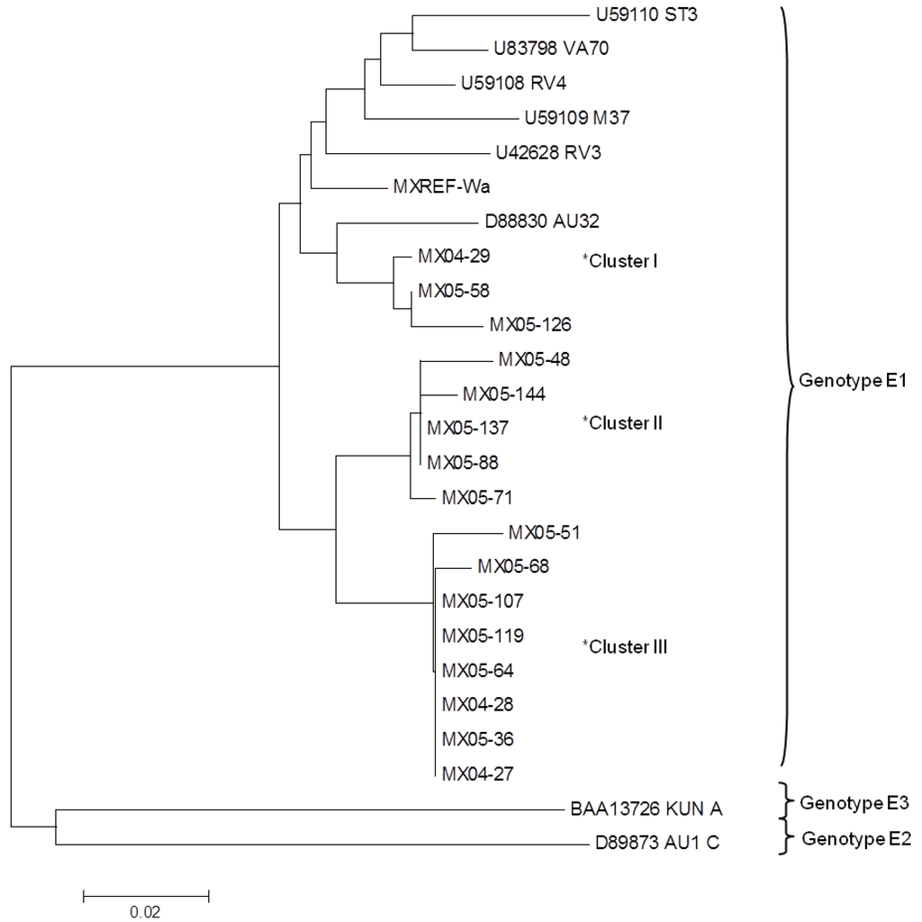 RNA positive samples for the rotavirus were retro transcribed and amplified by PCR to isolate the NSP4 gene using the primers Beg16-End722 or NSP41F-NSP42R [20,21]; although in several experiments, combinations of both primer pairs were required to achieve amplification. NSP4 genotype identification was performed by a multiplex-seminested PCR, with 10END722 or NSP42R as the external primers and Wa, Kun or RRV as the internal primers, which corresponds to genotypes E1, E2 and E3, respectively [37]. Samples of the amplified NSP4 gene were cloned using the pGEM-T vector (Promega Inc, Madison, WI) according to the manufacturer´s instructions. The plasmid with the NSP4 insert was purified by the Wizard SV Minipreps kit (Promega Inc, Madison, WI) and sequenced by the dideoxynucleotide chain termination method, using an ABI Prism Big Dye Terminator Cycle Sequencing Ready Reaction kit (PE Applied Biosystems, Whashington, DC). The DNA sequence was confirmed by sequencing both DNA strands of each of the different clones using the pUCM13 sense and antisense standard primers. The resulting sequences were analyzed with MEGA 5.0 and compared with other sequences reported in the GenBank data base; the phylogenetic tree was determined by the Neighbor joining method [54]. The GenBank accession numbers of NSP4 sequences used in sequence analysis were AB361285, AB008233, AB008237, AB213391, AB326290, AB326294, AB326963, AB361282, AF170830, AF260930, AY159640, AY159642, AY353740, AY353800, DQ909069, DQ909070, EF033202, EF033203, EF672575, EU679377, EU679382, U42628, U83798, AAO06852, AAT48079, AB008229 - AB008231, AB008234-AB008236, AB008238-AB008245, AB008247-AB008257, AB008259 - AB008263, AB022772, AB043026, AB043069-AB043078, AB196491, AB196492, AB196958, AB196959, AB211987-AB213392, AB232699, AB269688, AB303218, AB326286-AB326289, AB326293, AB326295, AB326297, AB326334, AB326336, AB326337, AB326347, AB326348, AB326962, AB326966, AB326969, AB326971, AB361276, AB361281, AB361284, AB361286-AB361288, ABK62862, ABU49806, ACF77153, ACF77154, ACJ54826, ACJ66758, ACJ66769, ACL80635, ACL80638, ACQ99541, ACY01369, ACY01381, ACZ51671, ADA70484, ADK46705, ADK46715, ADO78533, ADO78536, ADO78564, AEB79485, AEB79550, AEK69633, AET43468, AF161810-AF161815, AF170831-AF170833, AF173179, AF173181-AF173208, AF173211 - AF173214, AF174300 - AF174302, AF260928, AF260929, AF284776-AF284778, AF469676 - AF469679, AF506016, AF541921, AFJ68184, AFJ68397, AFK27432, AJ236757 - AJ236770, AJ236772 - AJ236774, AJ236778 - AJ236782, AJ400634, AY159630 - AY159632, AY159634 - AY159639, AY159641, AY159643, AY159644 - AY159647, AY353727, AY353728, AY353730 - AY353739, AY353741 - AY353746, AY353753 - AY353765, AY353767 - AY353790, AY353792 - AY353805, AY601540 - AY601544, AY629562, BAD84188, BAF97950, CAB36938, D88830, DQ146647, DQ146658, DQ146669, DQ146680, DQ189233 - DQ189237, DQ189240, DQ299876, DQ339147 - DQ339151, DQ490543, DQ492678, DQ525182 - DQ525188, EF011980, EF033204, EF059918, EF059919, EF059924, EF159574, EU679378 - EU679380, GAU78558, Q9YJN7, U59108, U59110.