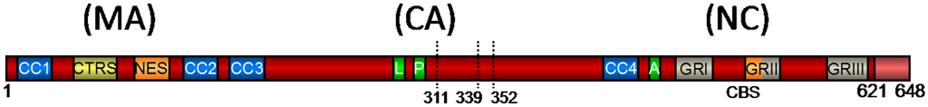 Schematic Representation of the Prototype Foamy Virus (PFV) Gag Precursor Protein [adapted from 22]. Numbers indicate the amino acid position in PFV Gag. The primary cleavage site is indicated by its amino acid position (621). Secondary cleavage sites are indicated by dotted lines and their amino acid position. CC1 – CC4, predicted coiled-coil motifs 1–4; CTRS, cytoplasmic targeting and retention signal; NES, nuclear export signal; L, late assembly domain; P, Pro-Pro-Pro-Ile motif (PPPI motif); A, assembly domain; GRI–III, glycine-arginine boxes I–III; CBS, chromatin-binding site; MA, matrix domain; CA, capsid domain; NC, nucleocapsid domain.
