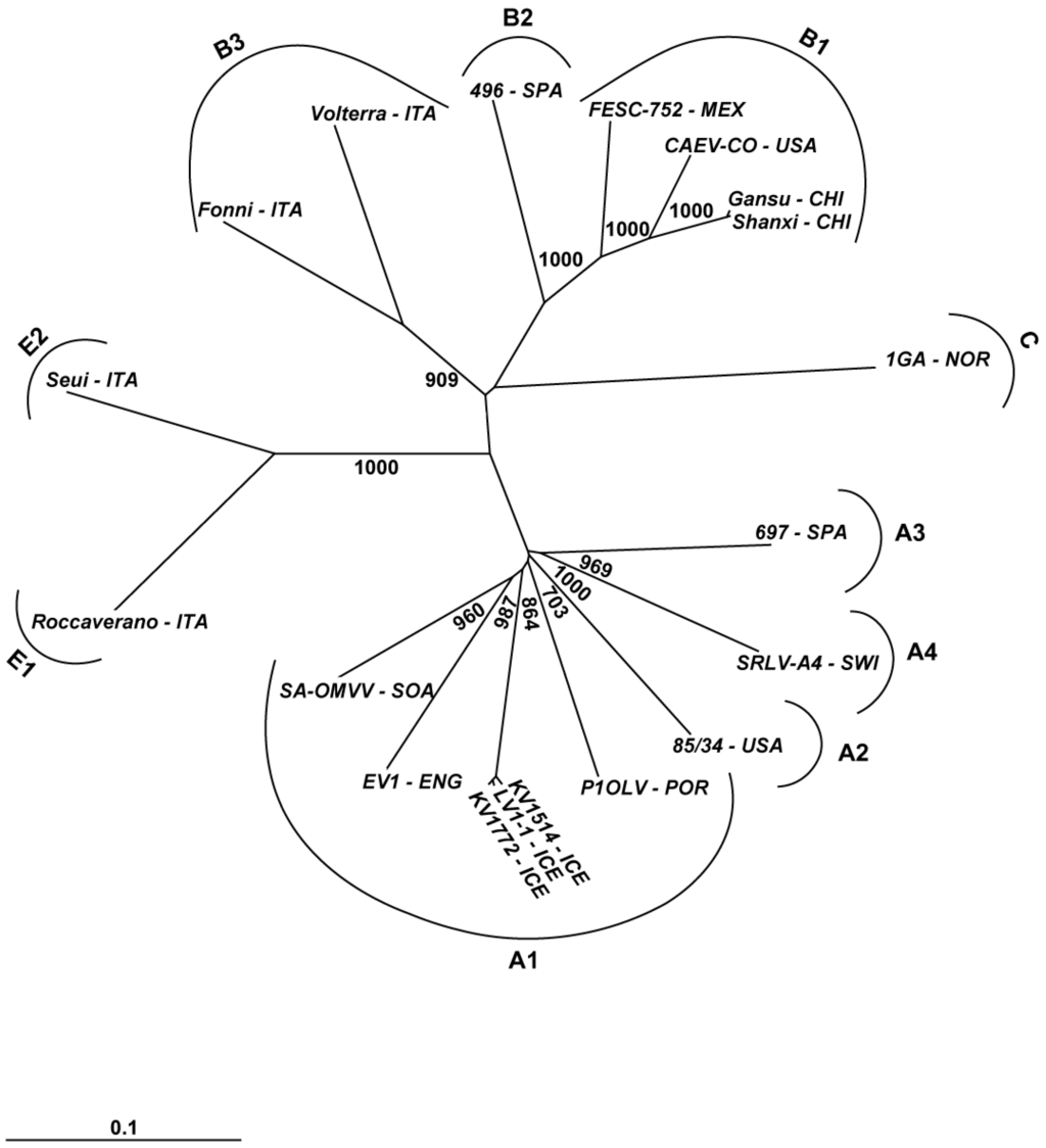 - Rosati, S.; Kwang, J.; Keen, J.E. Genome analysis of North American small ruminant lentiviruses by polymerase chain reaction and restriction enzyme analysis. J. Vet. Diagn. Invest. 1995, 7, 437–443. [Google Scholar] [CrossRef]