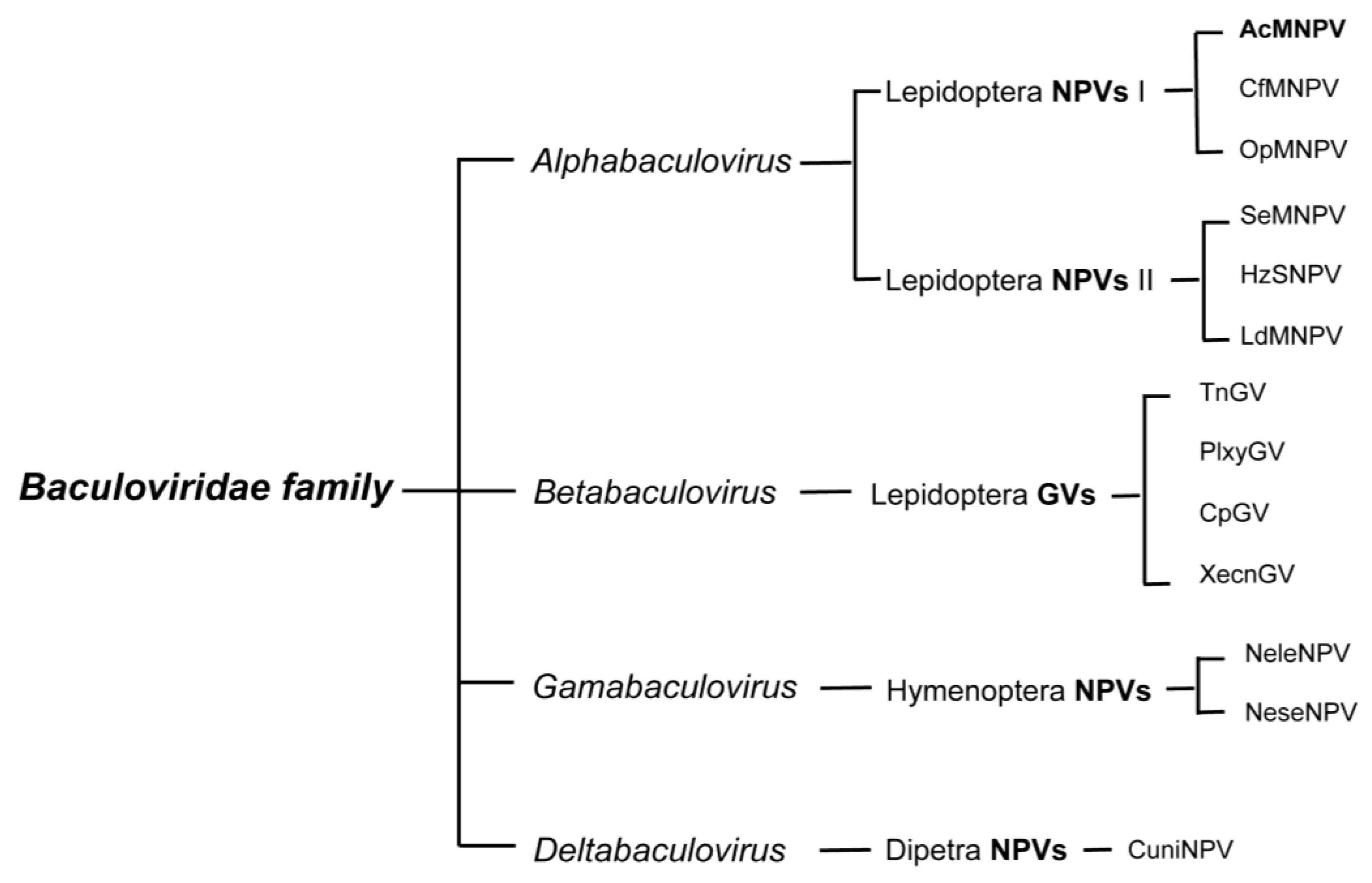 Classification of the Baculoviridae family. Only a small subset of characterized species within each group is listed. AcMNPV, the most studied baculovirus and most commonly used viral vector for baculovirus expression vector systems, belongs to the type I Alphabaculovirus genus.